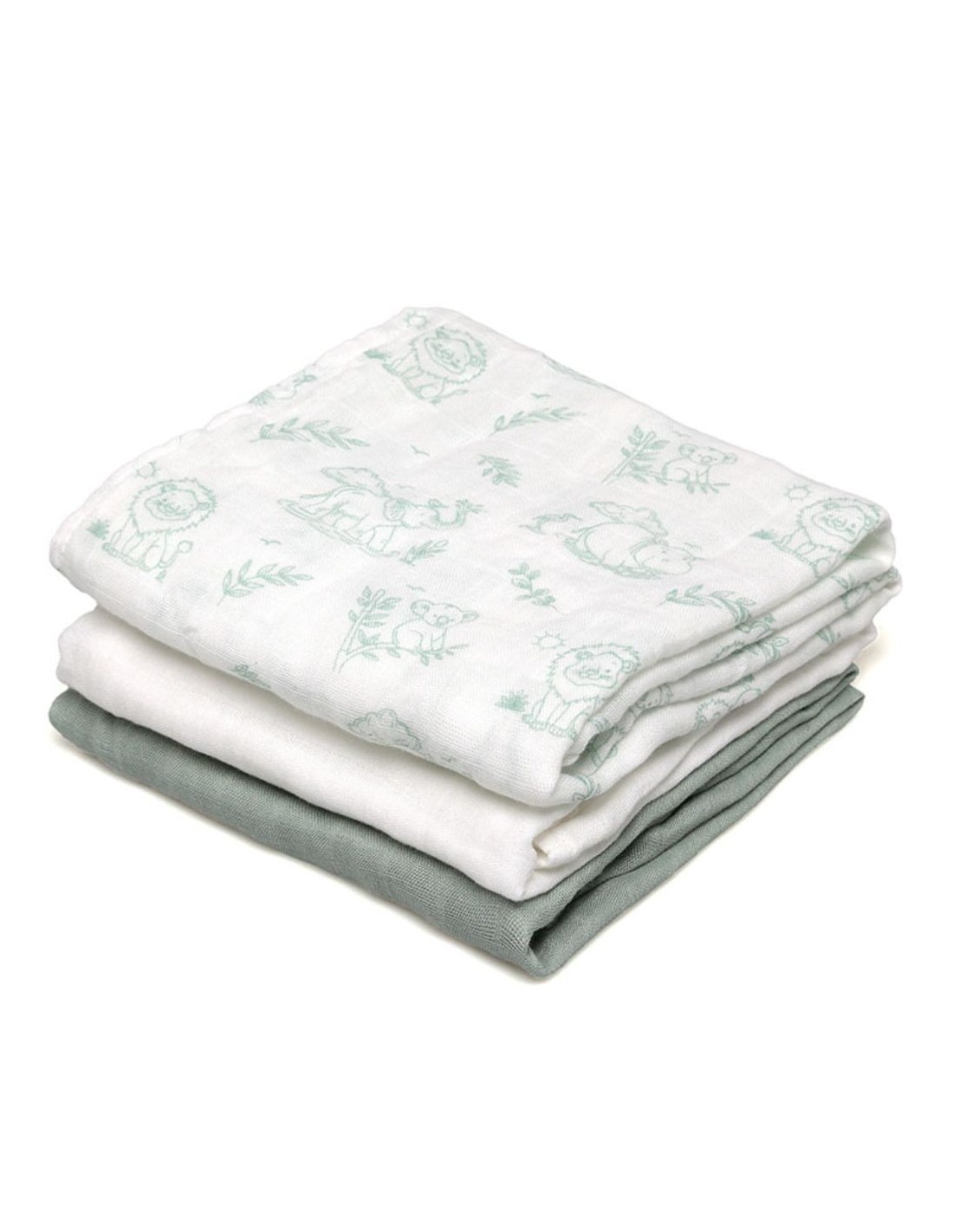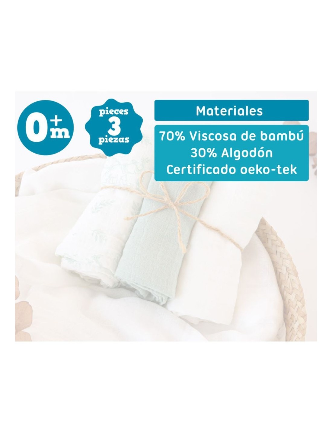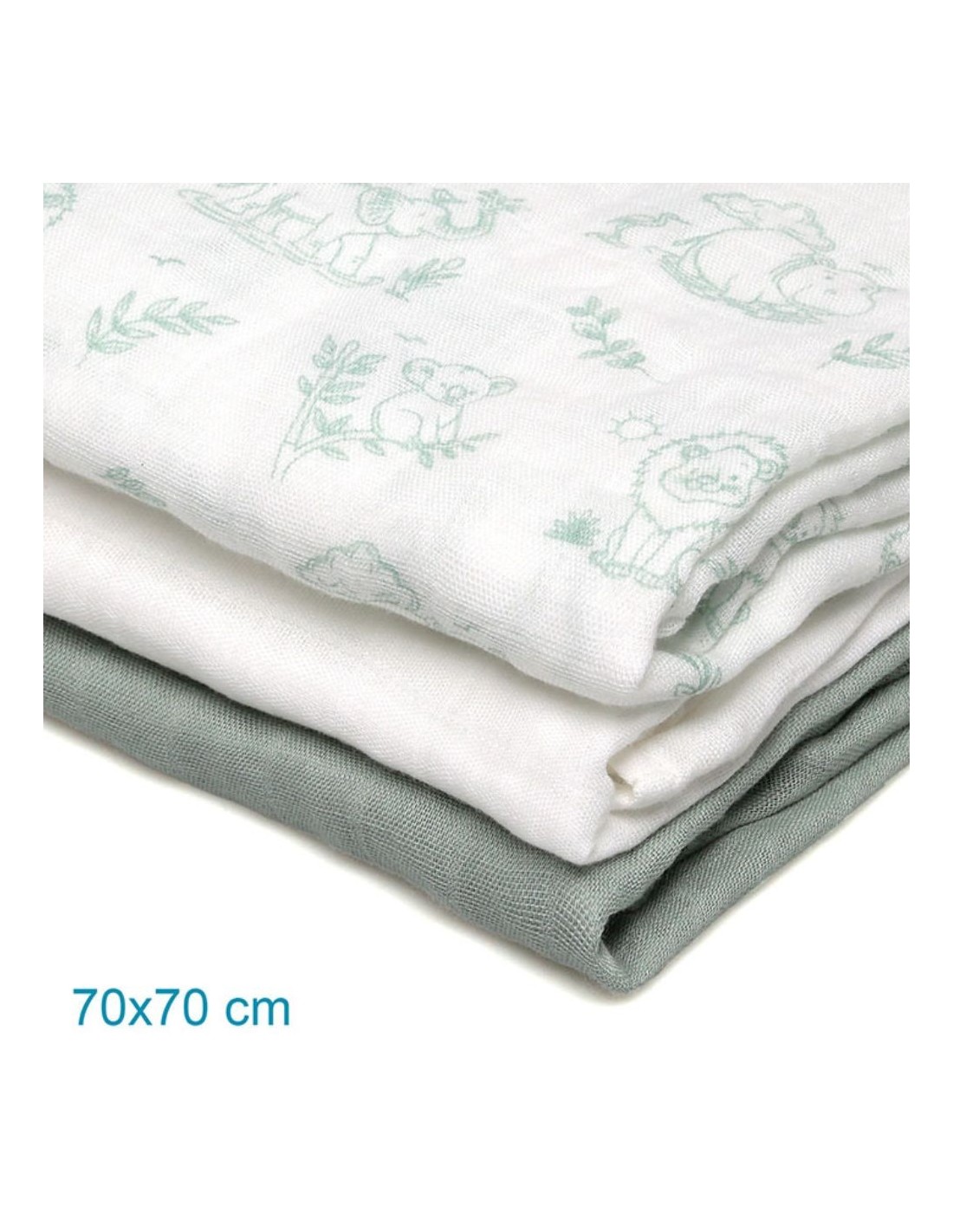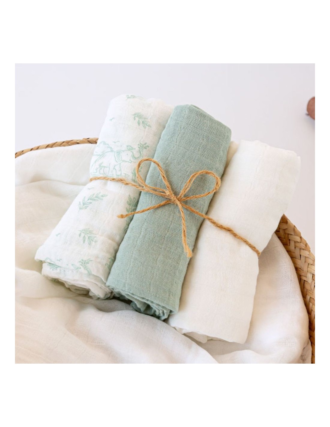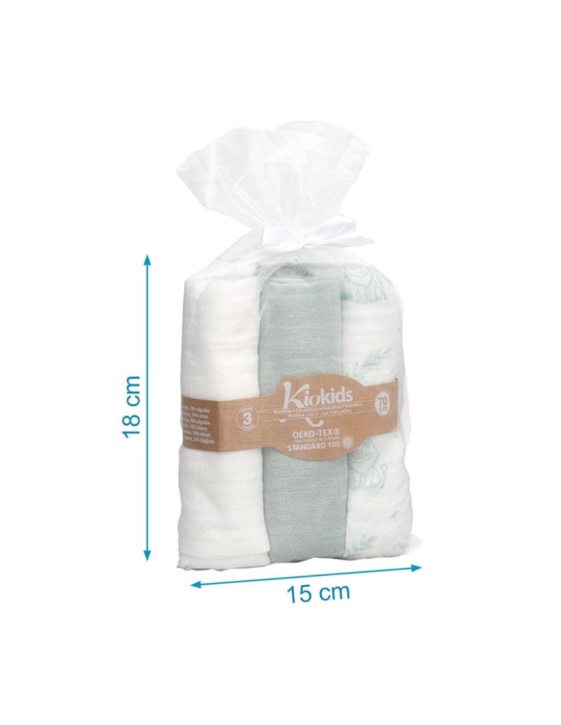 El Set de 3 muselinas verde bambú Kiokids 70x70 cm es un básico imprescindible en el cuidado del bebé desde el nacimiento.
