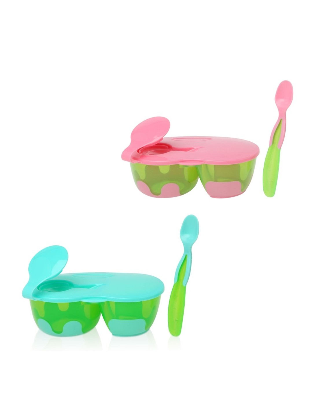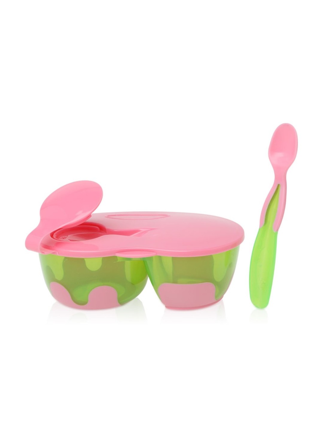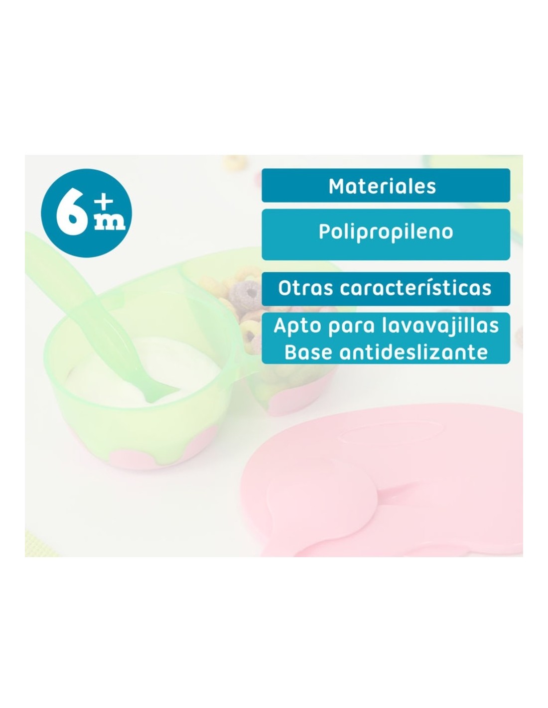 El juego se completa con una cuchara de tamaño reducido , con forma suave y bordes redondeados, ideal para las manos y bocas más pequeñas. Fabricado en materiales seguros para el bebé , es fácil de lavar y muy resistente al uso diario.
