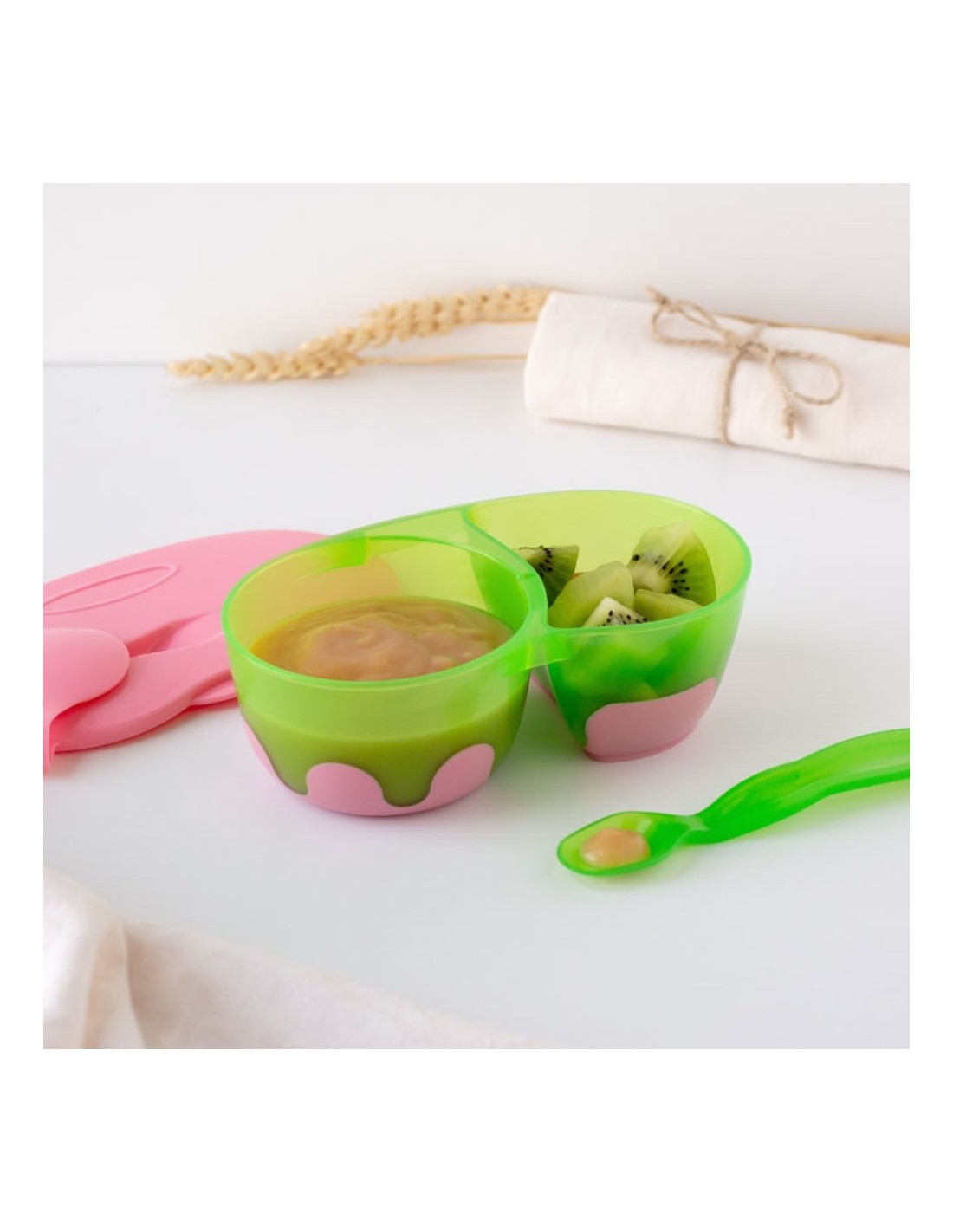 Este cuenco de Kiokids destaca por su diseño funcional y práctico , adaptado a las necesidades reales de las familias con bebés. Su doble compartimento permite dividir los alimentos sin que se mezclen, ideal para ofrecer puré y fruta, o papilla y yogur, por ejemplo.
