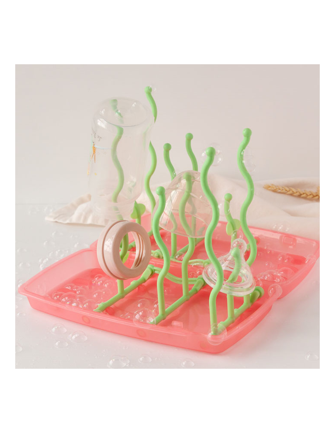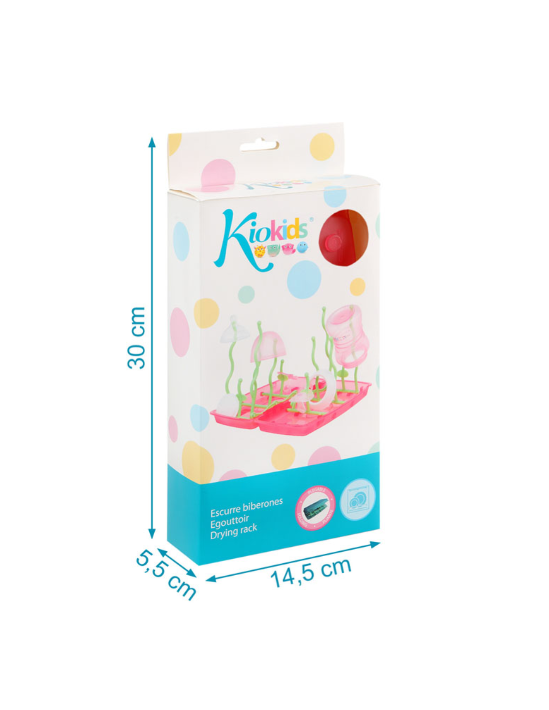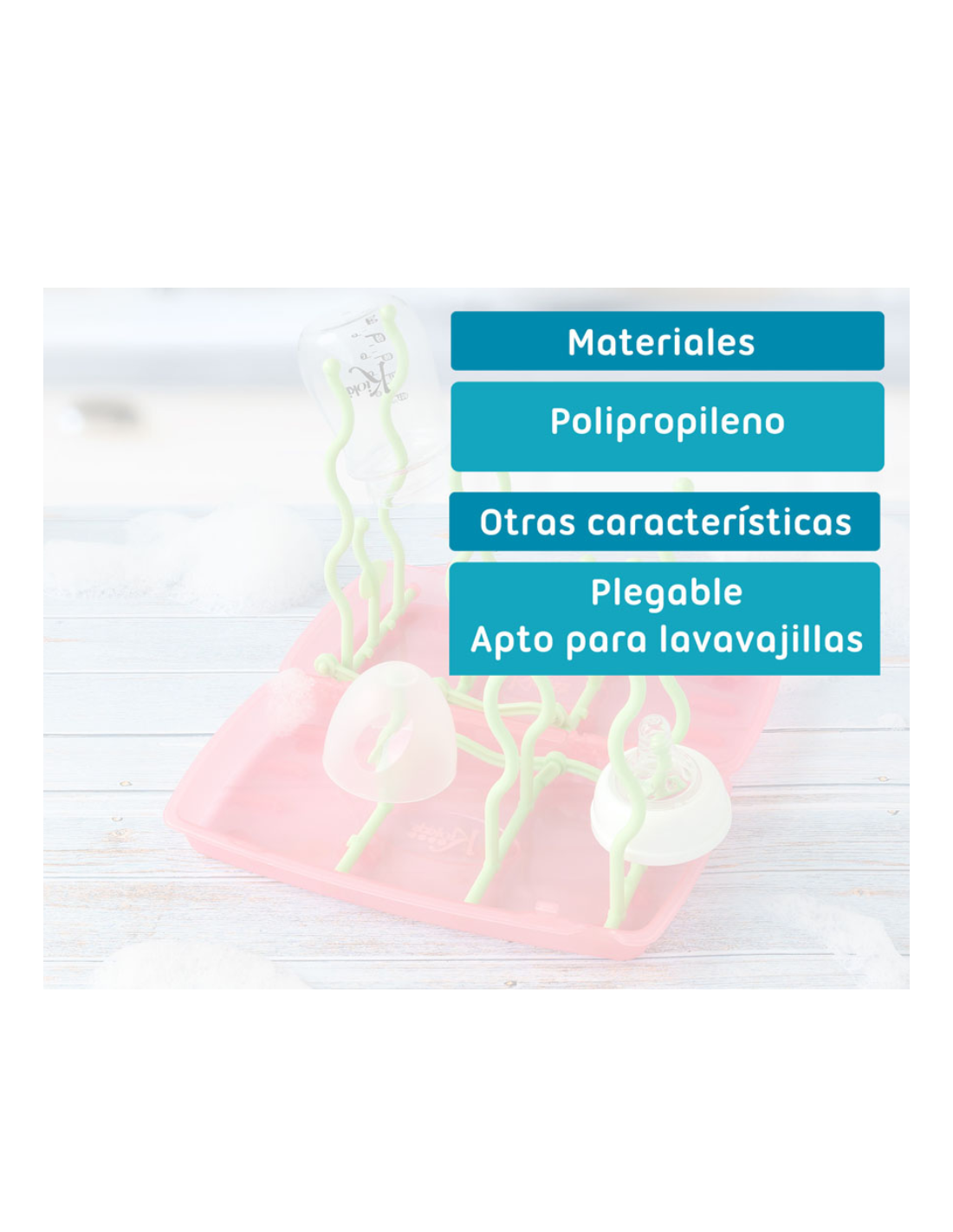 Diseño compacto tipo libro, ideal para llevar en el bolso o la maleta sin ocupar espacio. Al desplegarse, presenta varias varillas de diferentes alturas, perfectas para colocar tetinas, biberones, vasos y otros accesorios del bebé. Ligero y portátil, es el complemento ideal para el día a día o para llevar de viaje. Fácil de limpiar, con materiales resistentes al uso frecuente. Permite mantener los utensilios bien organizados y secos, evitando la humedad en superficies y manteniendo una buena higiene.