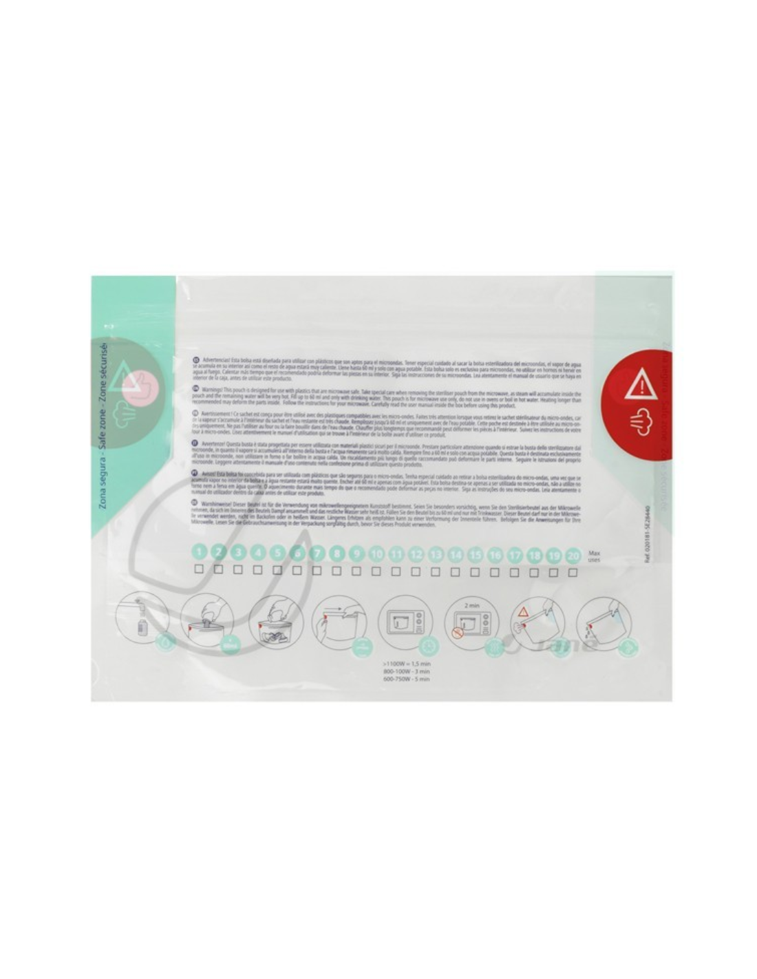 Estas bolsas de esterilización eliminan el 99,99% de bacterias en solo 3 minutos en el microondas. Son reutilizables hasta 20 veces por bolsa, lo que supone hasta 100 usos por pack. Su diseño incluye zona segura para sujeción, sistema antigoteo sin contacto y compatibilidad con microondas de diferentes potencias. Fabricadas con materiales libres de BPA y seguros para el bebé, ofrecen una forma portátil, rápida e higiénica de esterilizar artículos como biberones, chupetes o tetinas, tanto en casa como en movimiento.