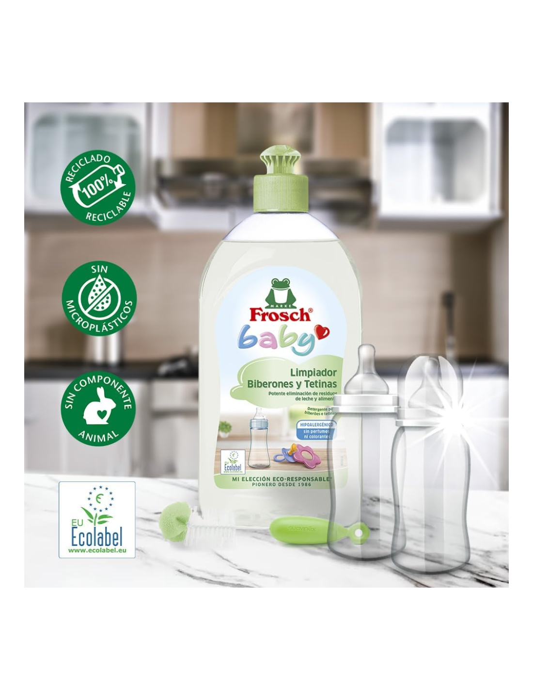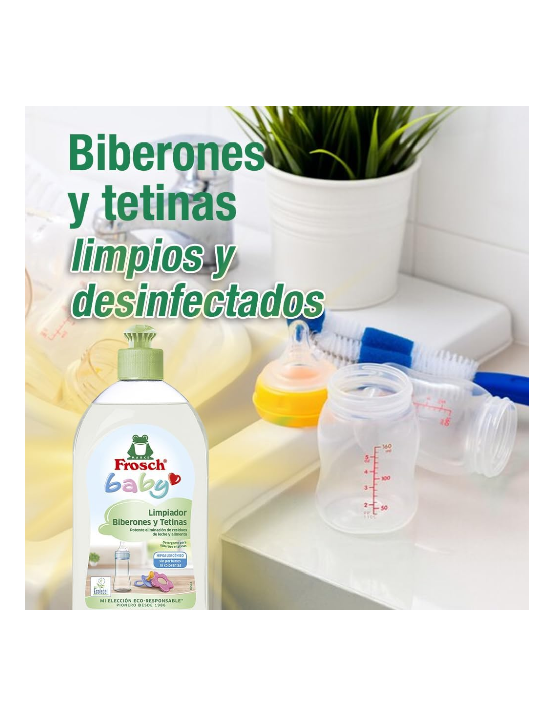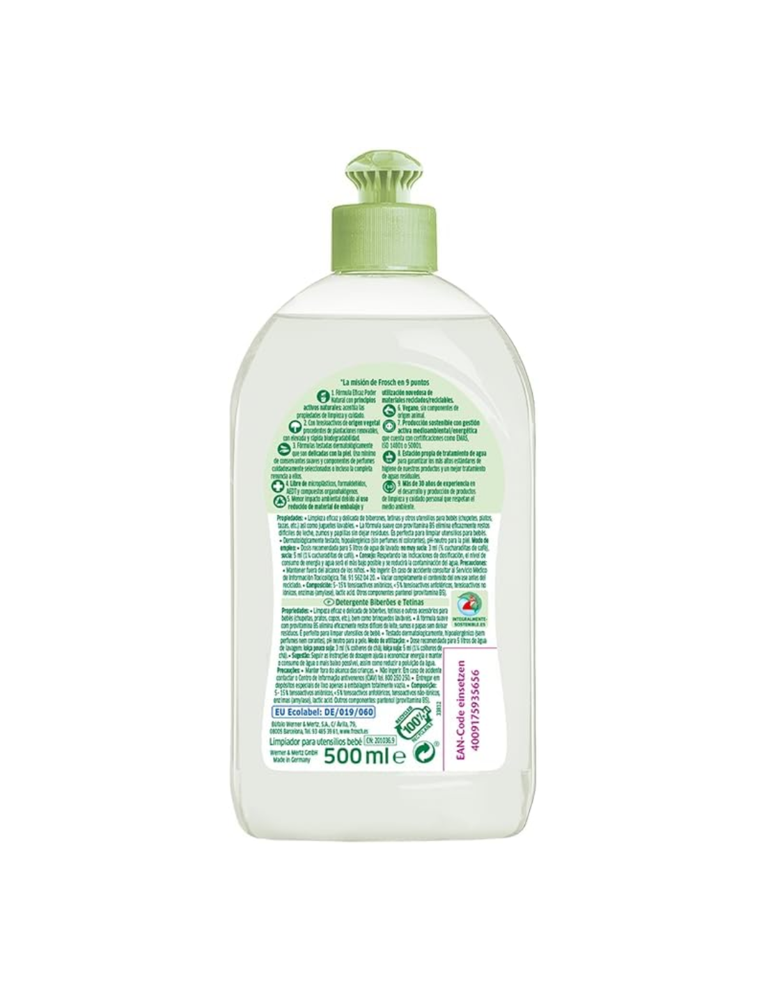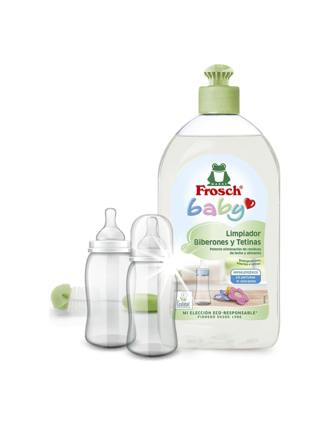 El Duplo Limpiador Biberones y Tetinas Frosch Baby 500 ml ofrece una limpieza profunda, segura y ecológica para todo tipo de utensilios de alimentación infantil: biberones, tetinas, chupetes, vajillas y juguetes de silicona o plástico. Su fórmula con provitamina B5 disuelve eficazmente restos de leche, zumos o papillas, incluso los más adheridos. Está formulado sin fragancias, colorantes ni residuos químicos agresivos, lo que lo convierte en una opción ideal para la delicada higiene de productos en contacto con la boca del bebé. Además, su composición es biodegradable y el envase es totalmente reciclable, ayudando a proteger el entorno. La textura ligera del limpiador lo hace fácil de enjuagar, asegurando que no queden residuos. Este duplo incluye 2 unidades de 500 ml, ideal para tener siempre a mano un limpiador fiable y respetuoso.