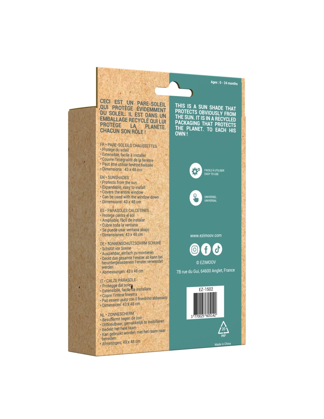 El Parasol Calcetín 2 uds Ezimoov es la solución más práctica y segura para proteger al bebé del sol durante los viajes en coche. Fabricado con tejido elástico transpirable con filtro UV, se ajusta perfectamente como un calcetín sobre la ventanilla, cubriendo toda la superficie sin necesidad de ventosas ni adhesivos.