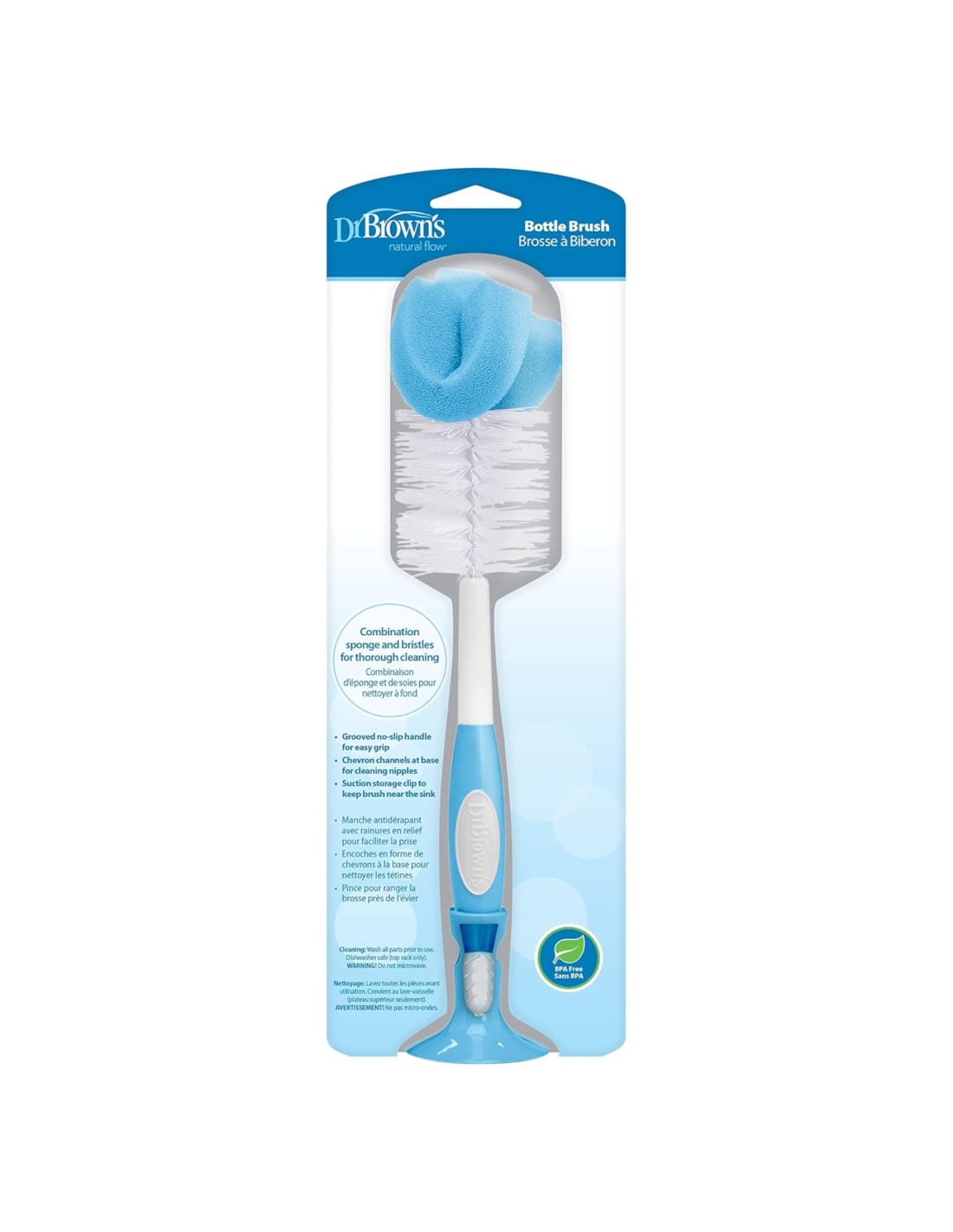 El cepillo limpia biberones Dr. Brown’s está diseñado para facilitar la limpieza a fondo de todos los biberones y accesorios de la marca. Su combinación de esponja absorbente y filamentos resistentes permite una limpieza eficaz incluso en zonas de difícil acceso. Cuenta con un acabado especial en la punta, ideal para limpiar tetinas y pequeños accesorios, garantizando una higiene completa. El mango ranurado antideslizante proporciona un agarre firme y cómodo durante el lavado.