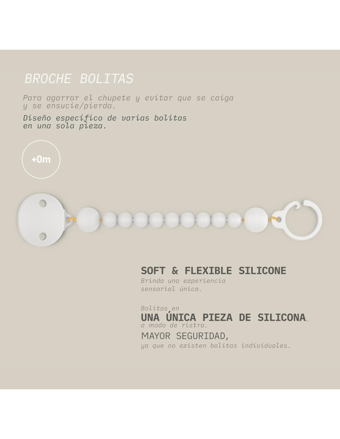 Fabricado en silicona médica, es ligero, flexible e higiénico, muy fácil de limpiar. Su diseño con bolitas está realizado en una sola pieza, lo que garantiza la seguridad del bebé al no tener piezas individuales que puedan soltarse.
