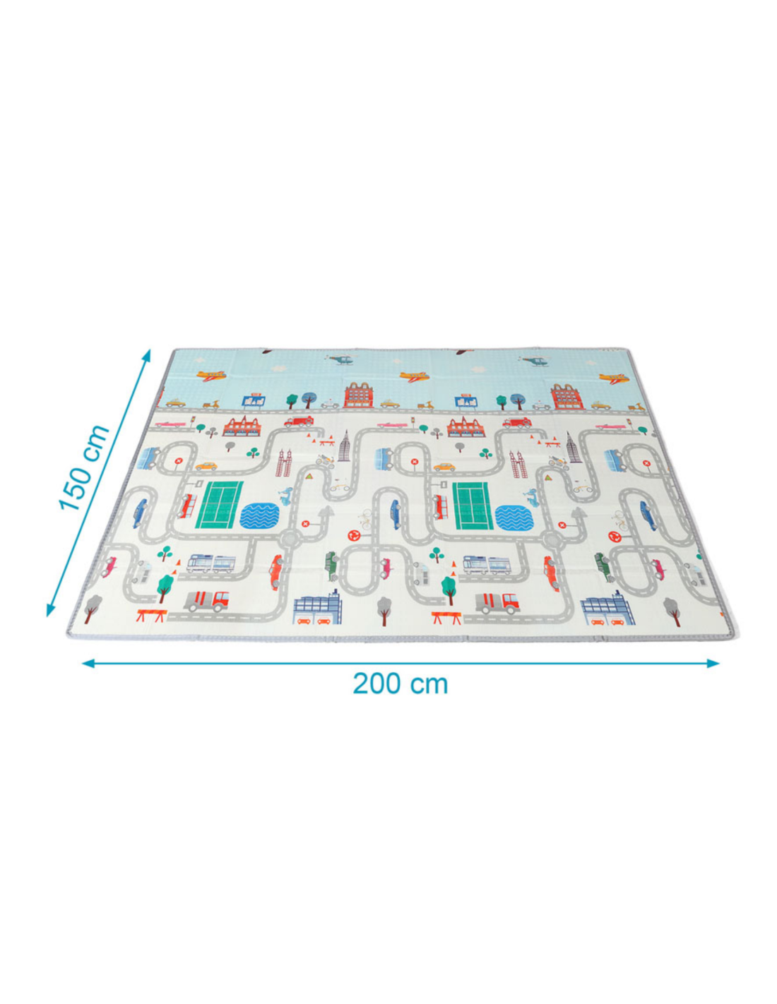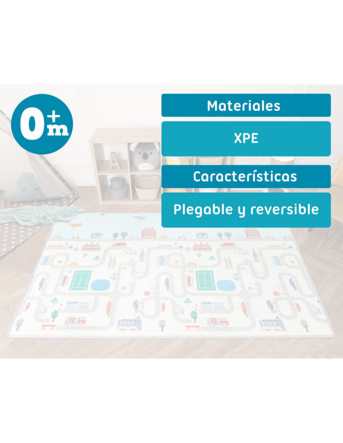 El tapete plegable reversible vehículos Kiokids XPE 200x150x1 cm ofrece un espacio amplio, seguro y divertido para que los bebés jueguen y aprendan desde sus primeros meses. Su diseño con circuitos y vehículos fomenta la imaginación, la motricidad y el aprendizaje temprano. Está fabricado en espuma XPE ligera, no tóxica y libre de BPA, con un grosor de 1 cm que proporciona comodidad y protección frente a golpes mientras el bebé gatea o juega.
