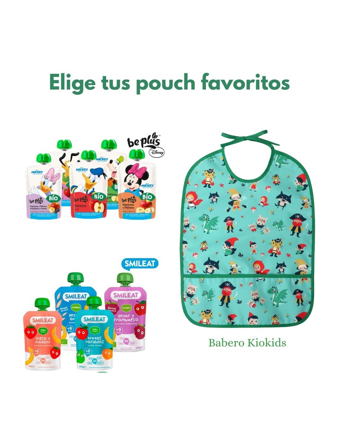 Este pack completo para bebés está diseñado para facilitar la alimentación diaria dentro y fuera de casa. Combina la practicidad de los pouch de fruta con la protección del babero impermeable Kiokids, ideal para evitar manchas y mantener al bebé limpio.