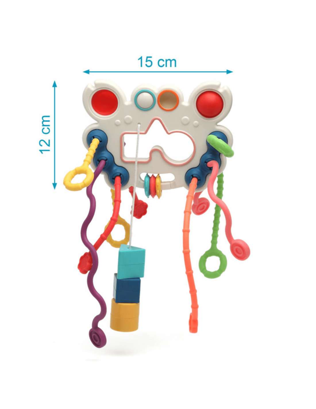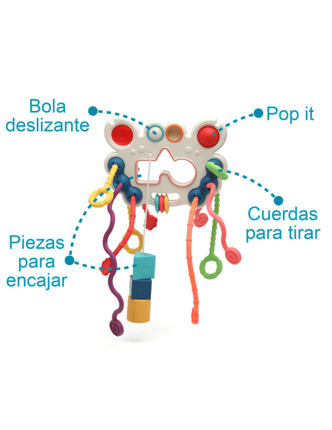 El juguete de actividades variadas Kiokids 15x12x5,5 cm es un centro de juegos compacto, innovador y educativo para bebés a partir de 3 meses. Diseñado para estimular los sentidos y la motricidad fina, combina diferentes actividades en un mismo juguete para mantener siempre entretenido al pequeño, ya sea en la cuna, en el suelo o en el carrito. Incluye cuerdas de silicona blanditas para tirar hacia delante y atrás, una bola deslizante para manipular y varias piezas encajables que ayudan a desarrollar la coordinación ojo-mano. Con sus colores vivos y texturas variadas, favorece la exploración sensorial y el aprendizaje a través del juego.