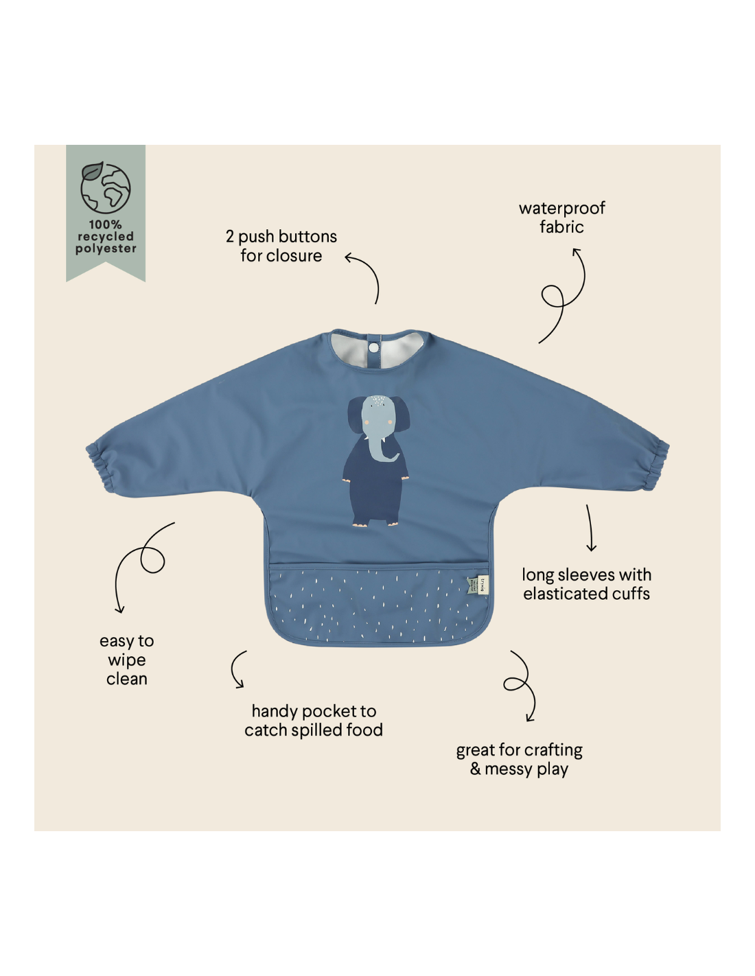 El babero con mangas Trixie está confeccionado con materiales de alta calidad , completamente libres de BPA y sustancias nocivas , asegurando la máxima seguridad para tu bebé. Su tejido ligero e impermeable facilita su limpieza y permite que se seque rápidamente tras cada uso. Gracias a su cierre ajustable con velcro, es fácil de poner y quitar, adaptándose perfectamente al crecimiento del bebé. Disponible en diseños y colores encantadores , convirtiéndose en un accesorio práctico y divertido.