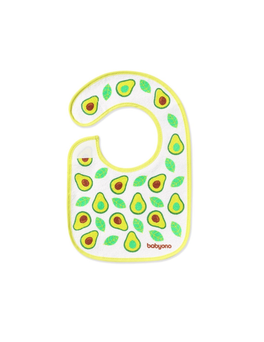 El babero de rizo BabyOno modelo aguacate verde "Eat and I Grow" es un accesorio práctico y alegre que protege la ropa del bebé durante la alimentación. Confeccionado en algodón de rizo absorbente, retiene líquidos y restos de comida de manera eficaz. Su diseño verde con un simpático aguacate estampado y la frase motivadora “Eat and I Grow” lo convierten en un complemento útil y divertido para la rutina diaria del bebé