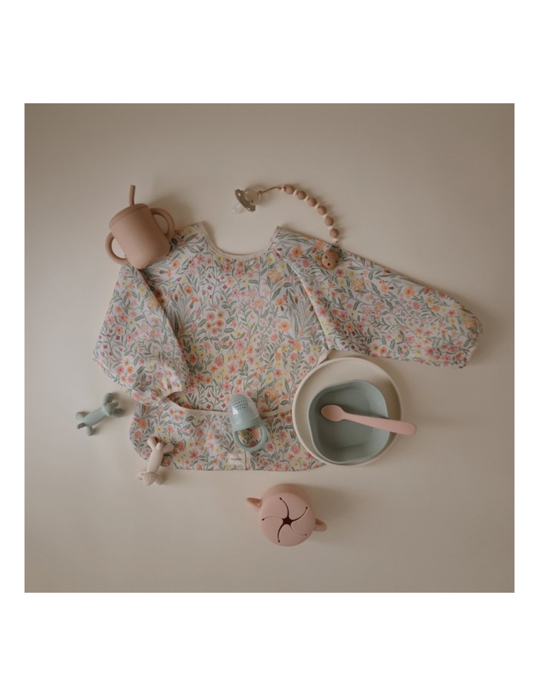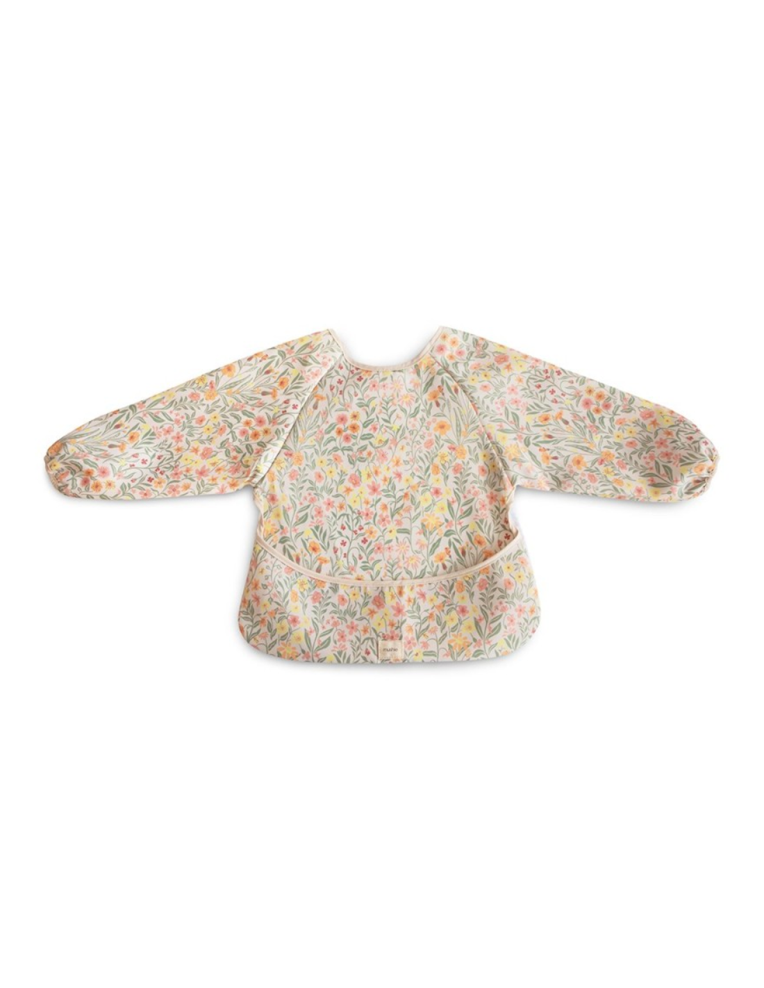 Este babero con mangas largas está confeccionado en material impermeable y resistente a las manchas, ideal para proteger la ropa del bebé en cada comida, merienda o momento creativo. Incorpora un amplio bolsillo recogemigas en la parte inferior, perfecto para atrapar restos de comida y mantener el entorno limpio. Las mangas con puños elásticos cubren completamente los brazos del bebé, y el cierre de velcro en la parte posterior del cuello asegura un ajuste cómodo y seguro, sin causar molestias.