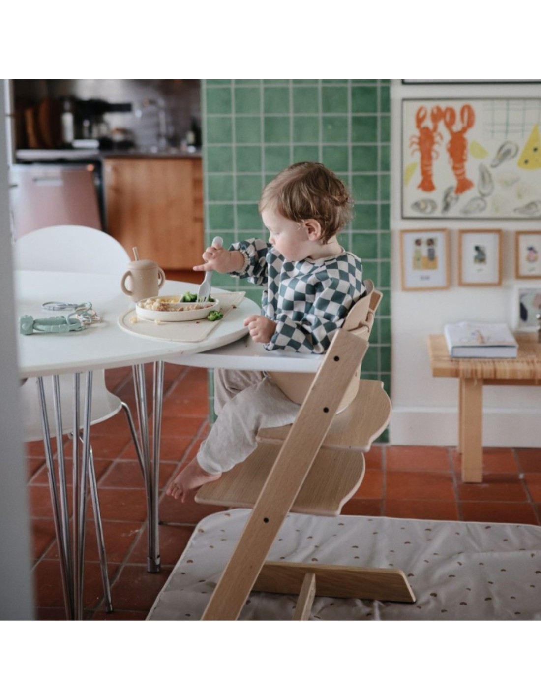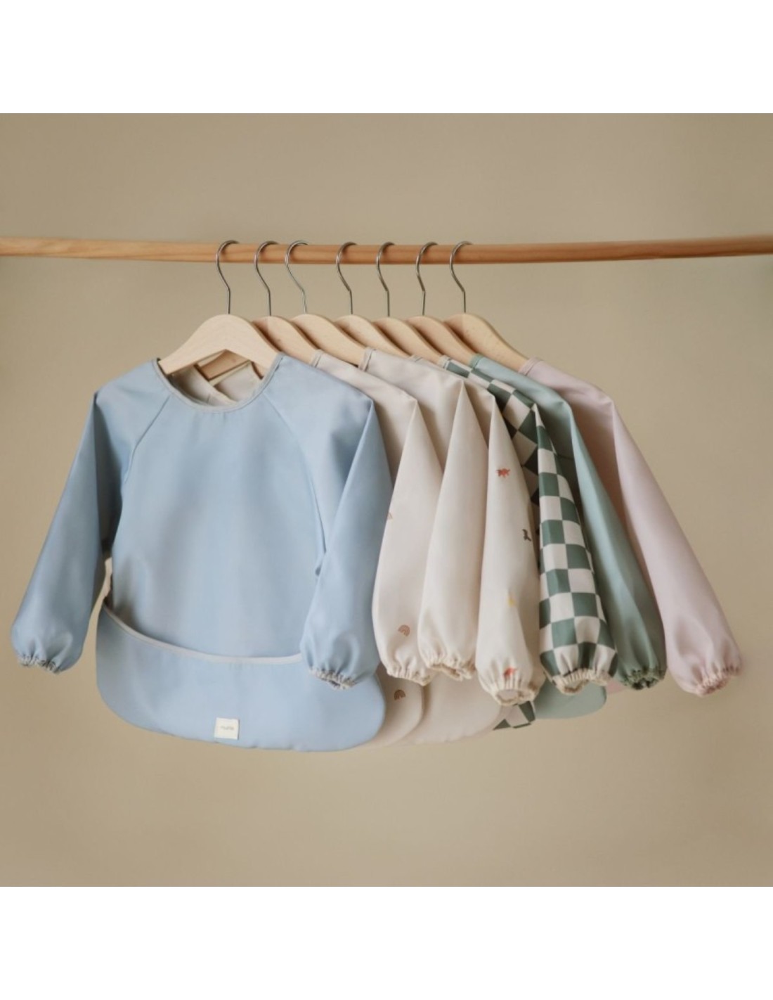 Babero con mangas Mushie – Olive Check (36x40 cm): Un babero impermeable, cómodo y elegante diseñado para proteger la ropa del bebé durante las comidas o actividades creativas.