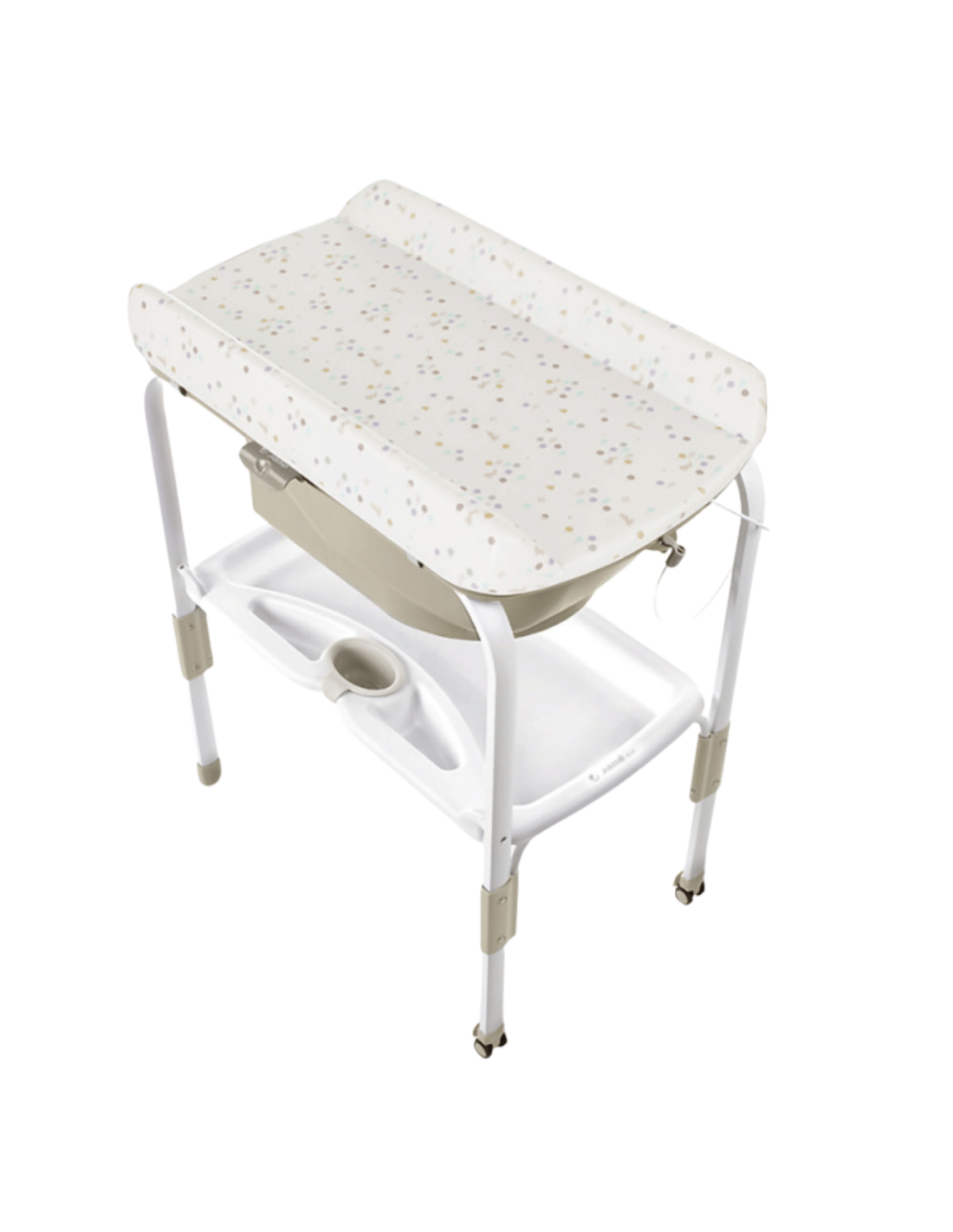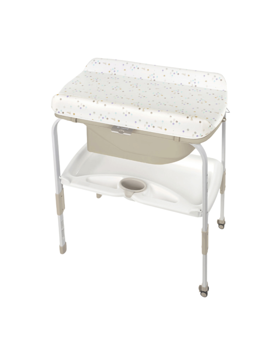 Incluye un cambiador mullido de espuma, pensado para ofrecer el máximo confort al bebé durante el cambio. En la parte inferior, incorpora una gran bandeja con compartimentos, ideal para tener siempre a mano pañales, toallitas, ropa y accesorios. Además, incluye una jarra de aclarado, facilitando aún más la rutina diaria.