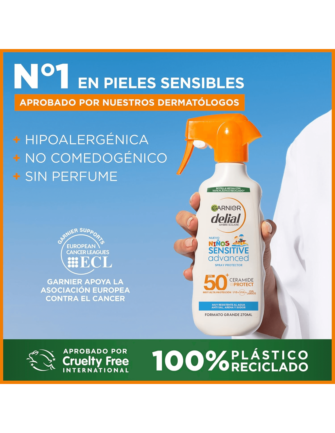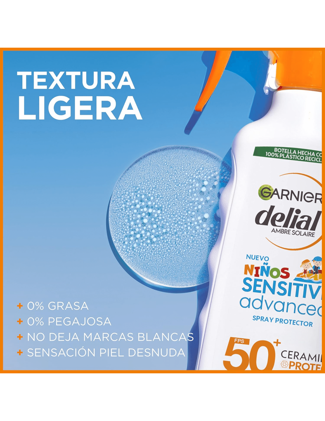 El Spray Solar Infantil Garnier Delial Sensitive Advanced FPS 50 está formulado especialmente para la delicada piel de los niños. Su fórmula ofrece una protección muy alta contra los rayos UVA/UVB y ayuda a prevenir quemaduras solares y daños cutáneos a largo plazo. La fórmula está enriquecida con tecnología Ceramide Protect, que contribuye a reforzar la barrera cutánea, mantiene la piel hidratada y evita la irritación. No contiene perfumes ni parabenos, y ha sido testada dermatológica y pediátricamente para minimizar el riesgo de alergias.
