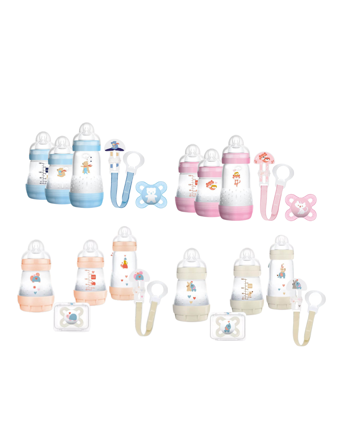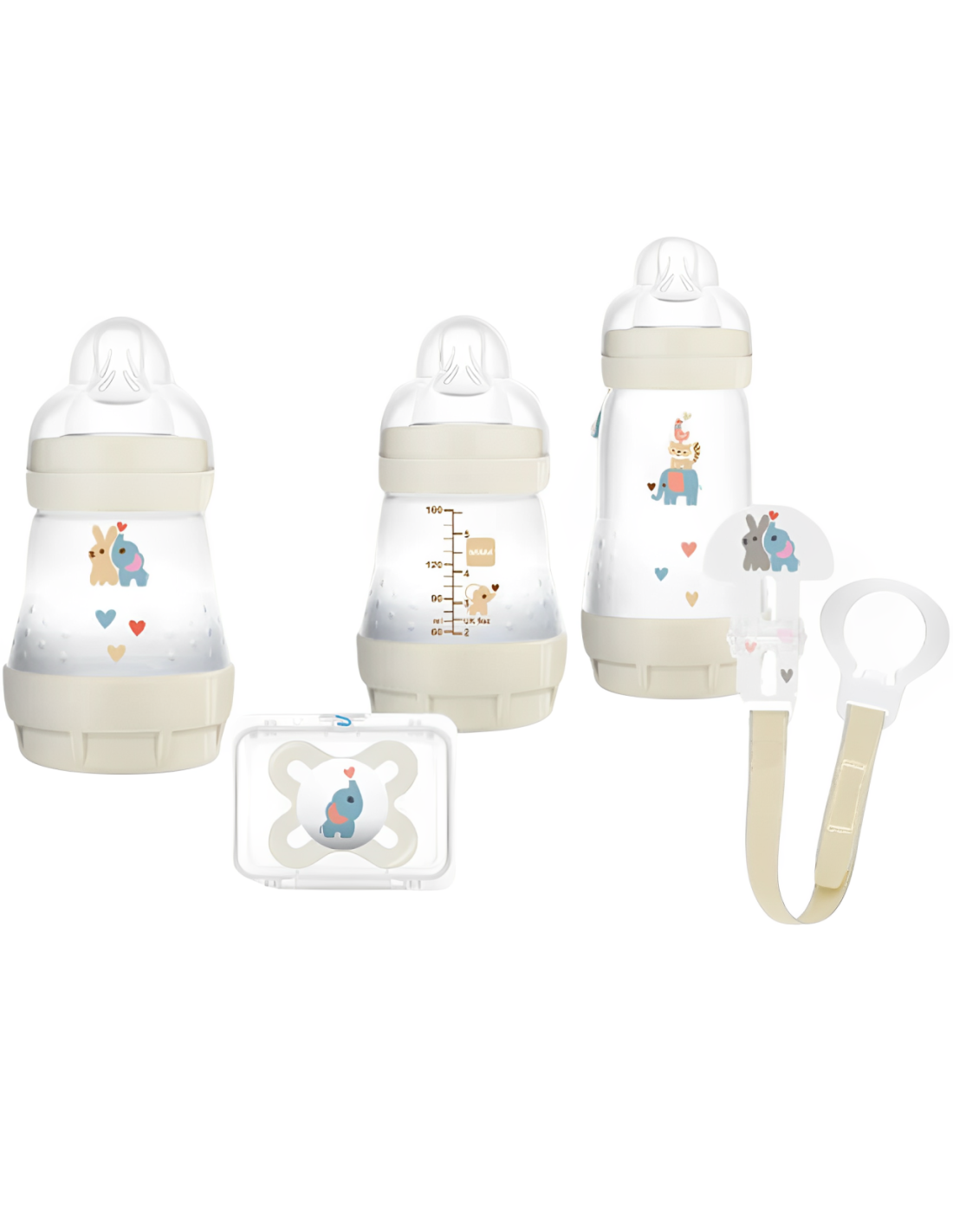 El Set para Recién Nacido MAM Baby (0–6M) incluye todo lo necesario para acompañar los primeros meses de vida del bebé: biberones Easy Start Anti-Cólicos con base ventilada, tetinas de silicona SkinSoft™ de alta aceptación, un chupete Start 0–2M o Comfort 0–3M (según versión), y discos selladores para conservar la leche.