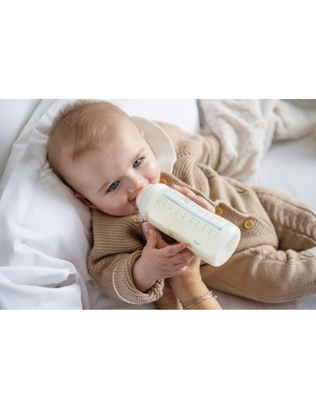 Los biberones Transition+ de Tigex incorporan el nuevo indicador de Control de Temperatura, para evitar dar el biberón demasiado caliente al bebé. Tiene forma de termómetro, está en la escala de medición y el color cambia con la temperatura del contenido del biberón. Si el líquido en la botella está por encima de 37 ° C, el termómetro de la botella se vuelve blanco, si el líquido está a 37°C o menos, permanece azul.