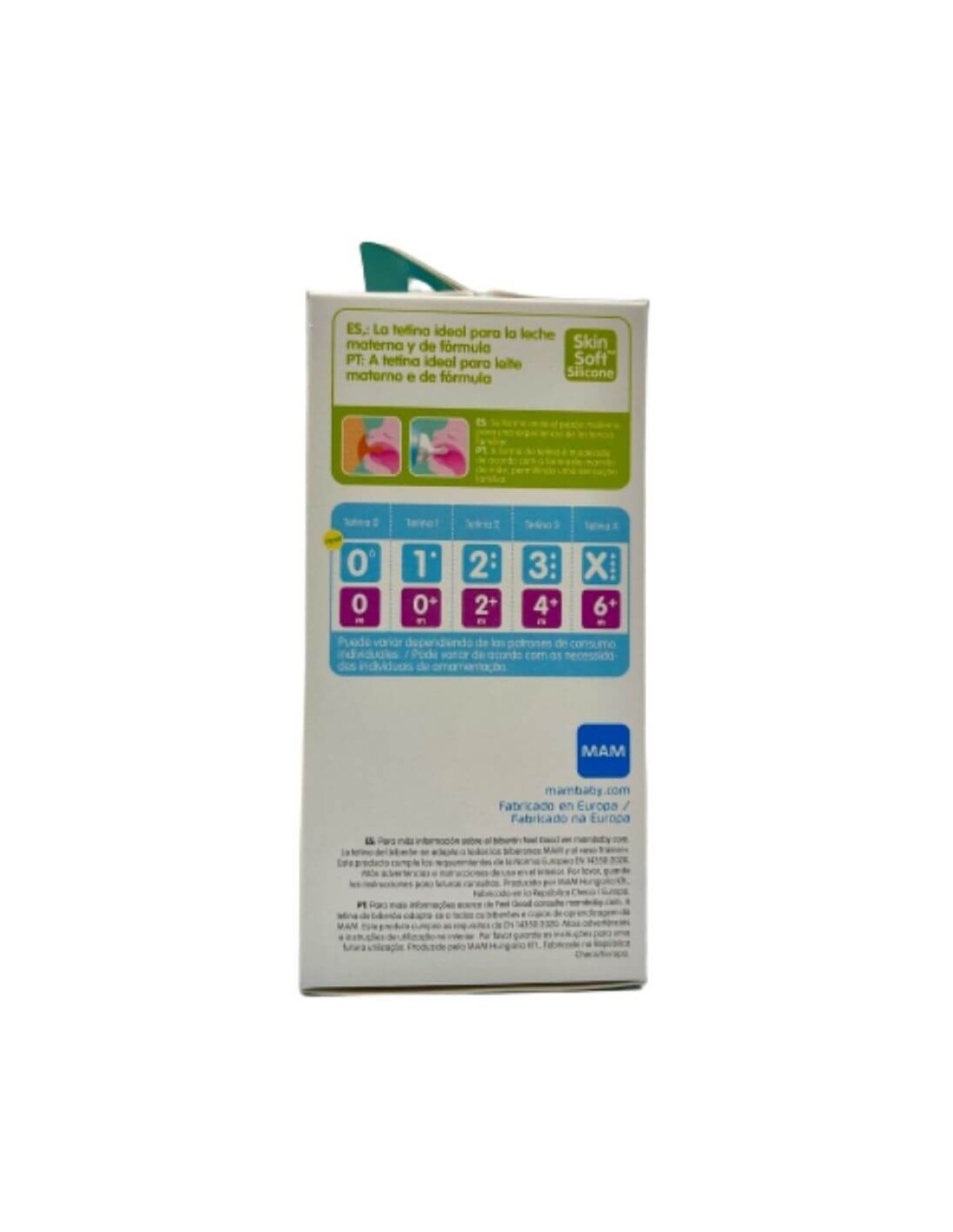 Incluye tetina de silicona SkinSoft™ con flujo lento (S) de alta aceptación. La boca ancha facilita el llenado y la limpieza, y el cuerpo ergonómico mejora el agarre. Compatible con tetinas y accesorios MAM.