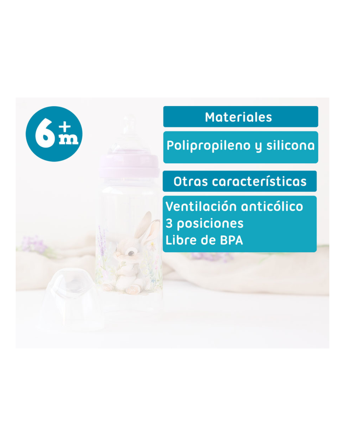 Este biberón de boca ancha ofrece una mayor superficie de apoyo para los labios del bebé, facilitando también su llenado y limpieza . Su tetina de silicona de alta calidad no absorbe olores ni sabores, y mantiene su forma y textura con el uso, siendo apta para lavavajillas y esterilizadores . Además, cuenta con un sistema anticólicos que permite un flujo constante de leche, reduciendo el riesgo de cólicos en el bebé. Las tetinas universales de 3 posiciones permiten regular el flujo simplemente girando el biberón: posición 1 para flujo lento, posición 3 para líquidos más densos. El exterior presenta un diseño alegre en color lavanda, combinando estética y funcionalidad a la perfección. Forma parte de la colección Honey, disponible en varios colores. Libre de BPA y con materiales seguros para la salud de tu bebé.