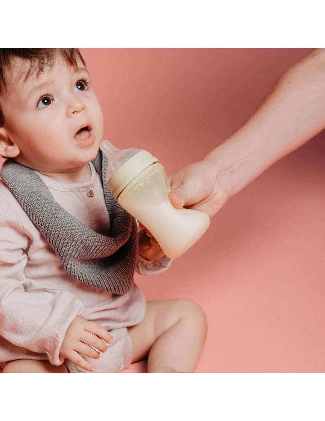 Botella flexible y blandita de tacto aterciopelado que brinda una experiencia sensorial única. Con tratamiento foto-oxidación que minimiza la adhesión de pelusas y partículas de suciedad a la botella. Pensando en aquellos consumidores preocupados por los microplásticos, ya que la leche/líquido no entra en contacto con ninguna pieza plástica, sólo toca silicona