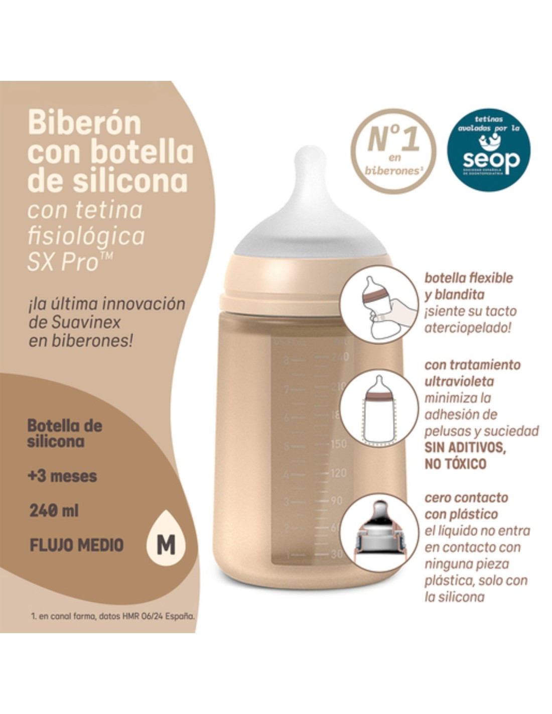 Su botella de silicona médica flexible es ligera, resistente y muy agradable al tacto, imitando la suavidad de la piel materna. La tetina fisiológica SX Pro de silicona flujo medio (M) respeta el desarrollo oral del bebé y reproduce la forma del pezón durante la succión.