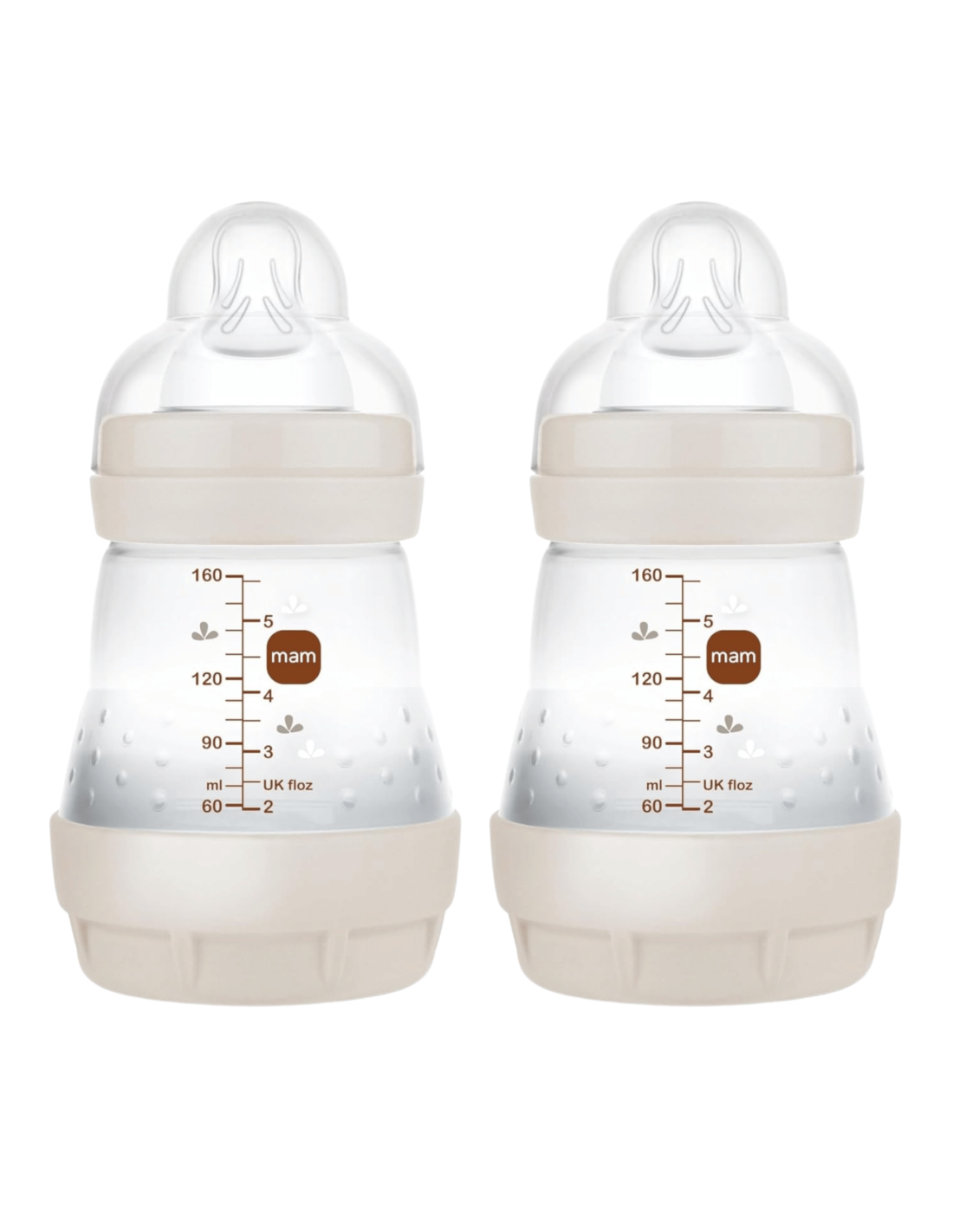Biberón Easy Start Anti-Colic MAM 160 ml (Pack 2). Con base ventilada anticólicos, tetina SkinSoftTM de flujo lento y sistema de autoesterilización en 3 minutos.