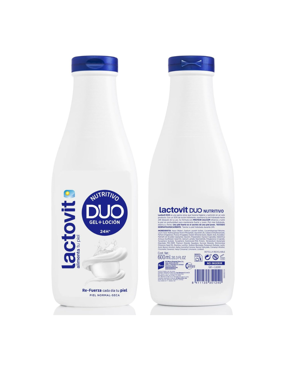 El Dúo Lactovit Gel de Baño + Loción Nutritiva 600 ml combina dos imprescindibles para el cuidado diario de la piel:
