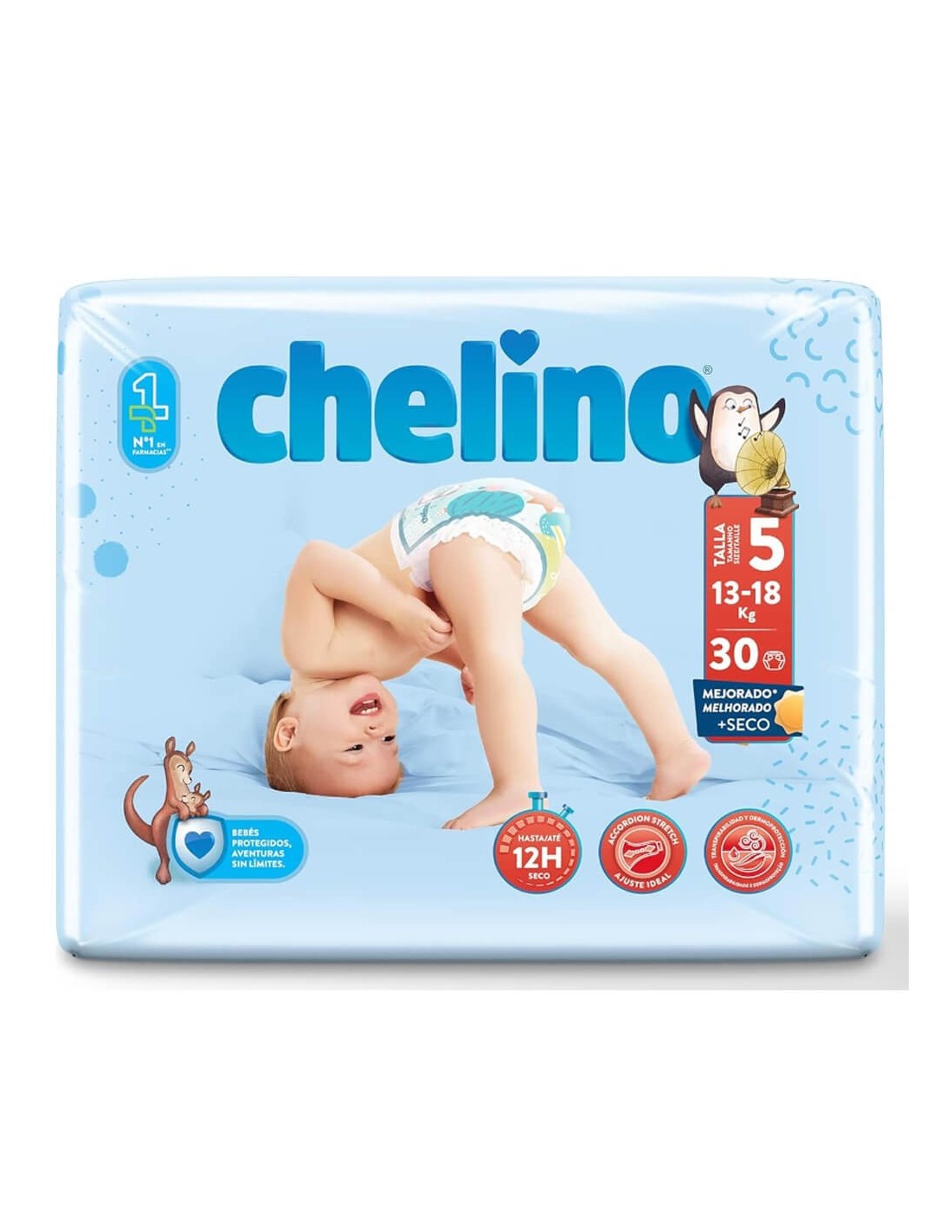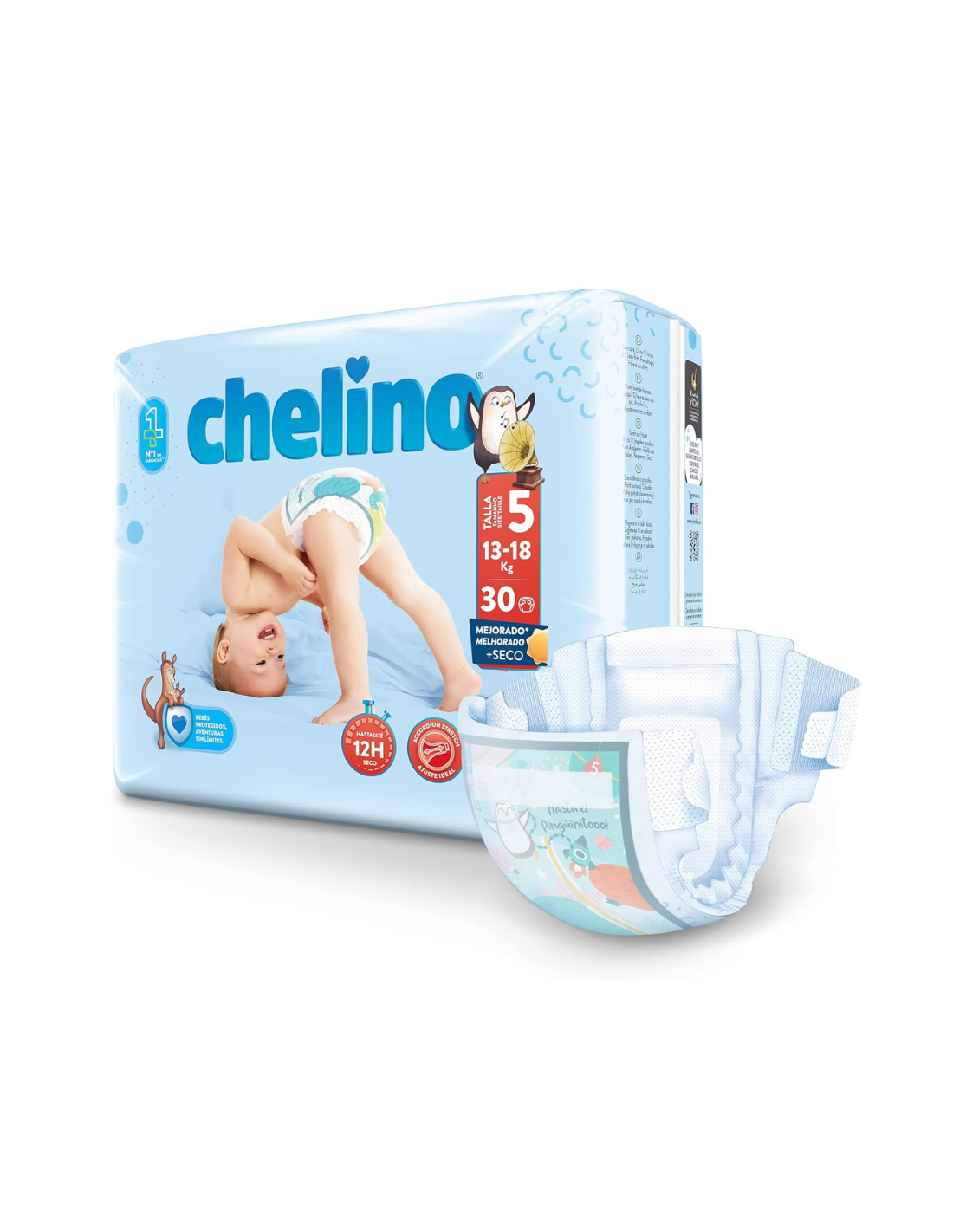 Los Pañales Chelino Talla 5 (15–18 kg) están diseñados para ofrecer una protección completa, suavidad y confort al bebé en su etapa más activa. Su tecnología de absorción avanzada permite mantener la piel seca durante más tiempo, proporcionando una sensación de frescor y seguridad tanto de día como de noche.
