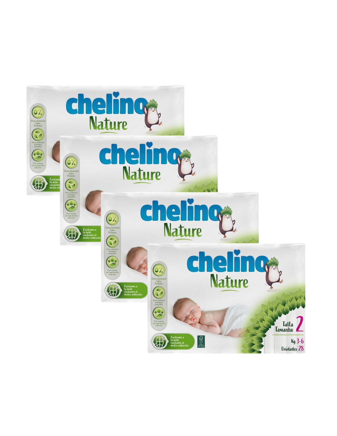 El Pack 4 Pañales Chelino Nature Talla 2 (3–6 kg) contiene 112 pañales diseñados para ofrecer máxima absorción, suavidad y respeto por la piel del bebé. La gama Chelino Nature utiliza celulosa certificada FSC® y materiales seleccionados para garantizar un alto rendimiento día y noche con un ajuste cómodo.