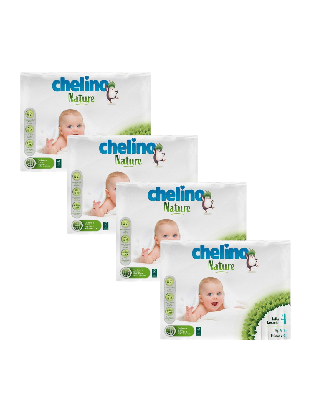 El Pack 4 Pañales Chelino Nature Talla 4 (9–15 kg) contiene 136 unidades diseñadas para ofrecer una protección natural, eficaz y respetuosa con la piel del bebé. Su avanzada tecnología de absorción y sus materiales sostenibles garantizan un rendimiento excelente y un cuidado delicado día y noche.