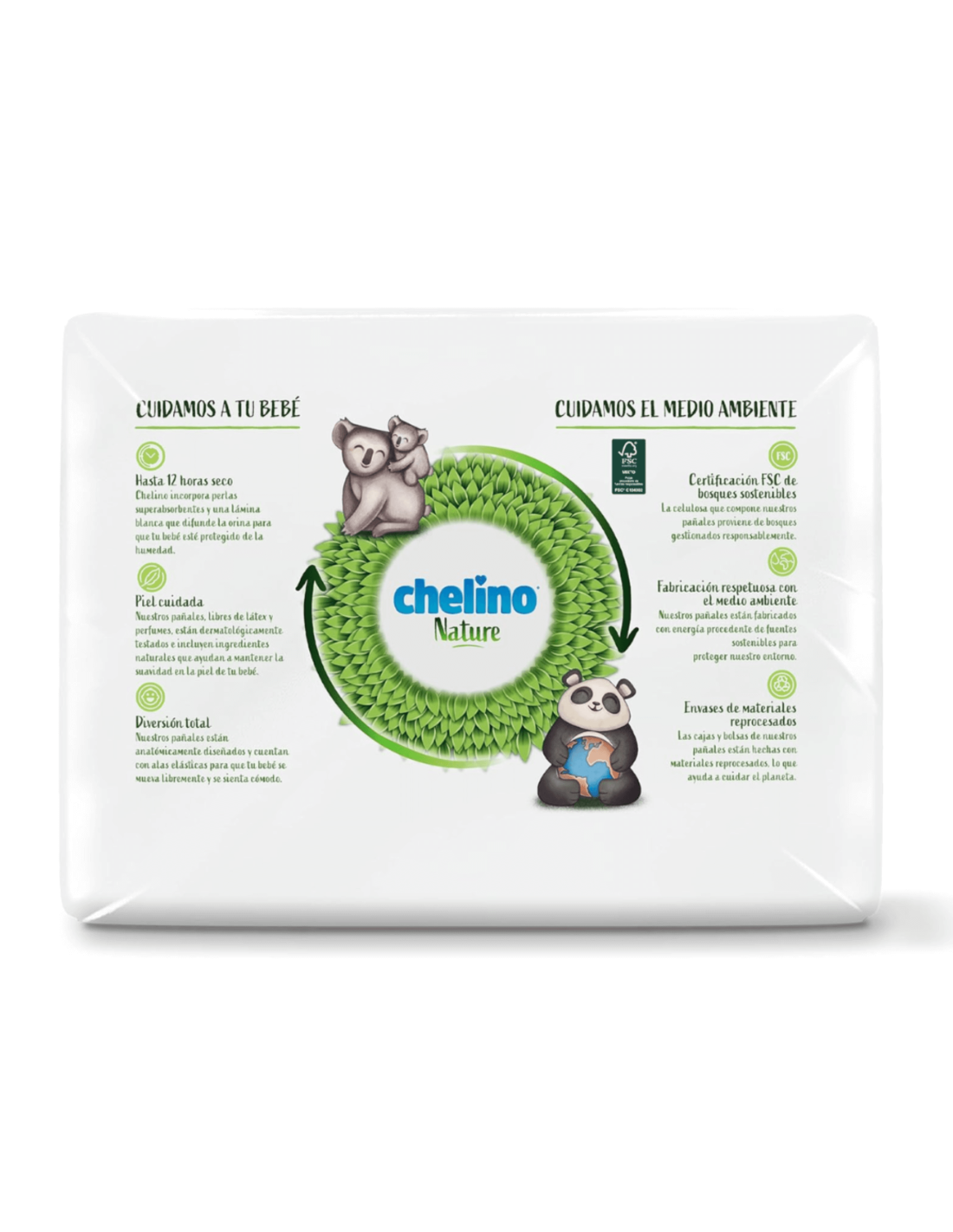 Los pañales Chelino Nature destacan por estar fabricados con materiales ecológicos y sostenibles, ofreciendo una opción más respetuosa con el medio ambiente sin comprometer la alta absorción y la protección del bebé.