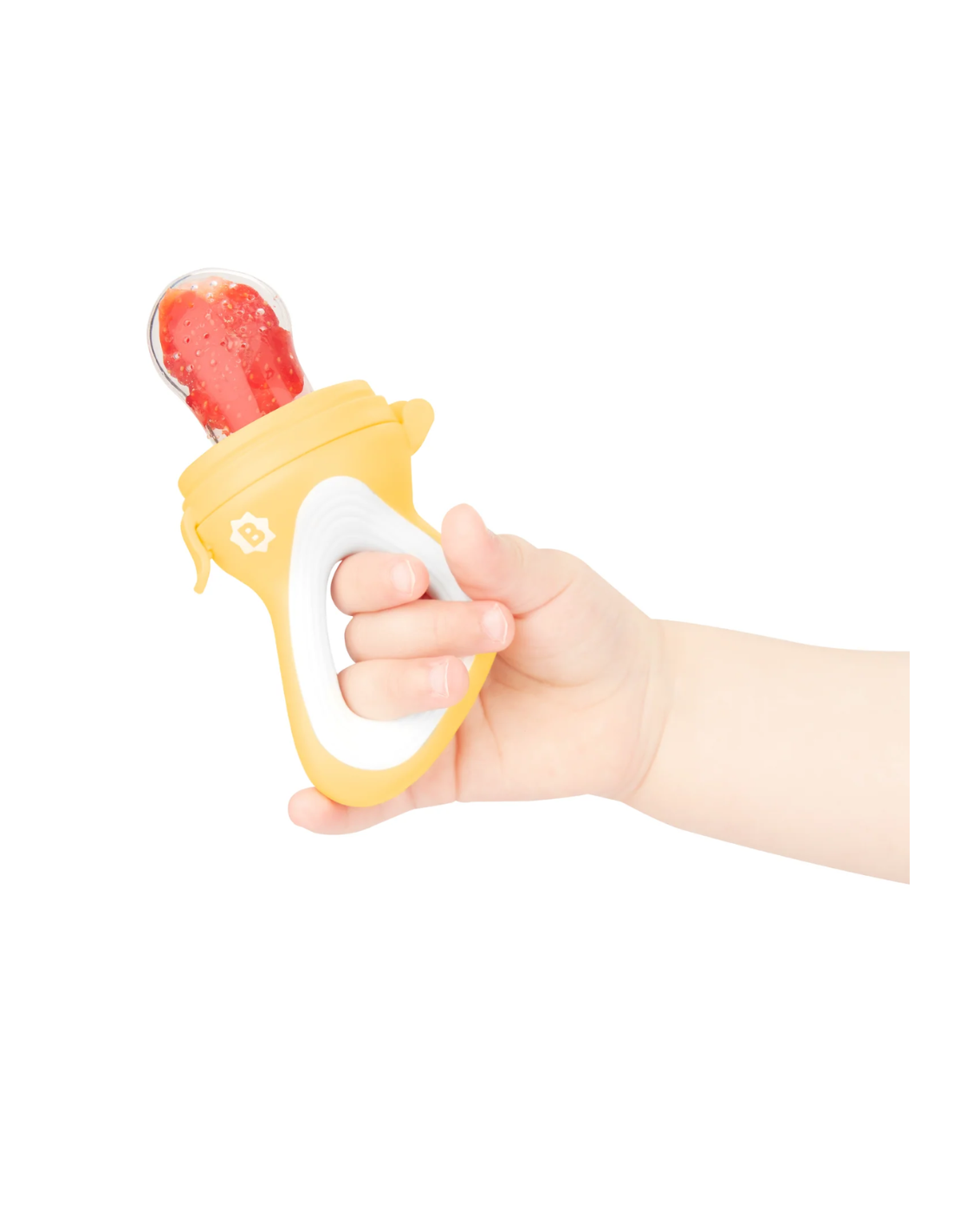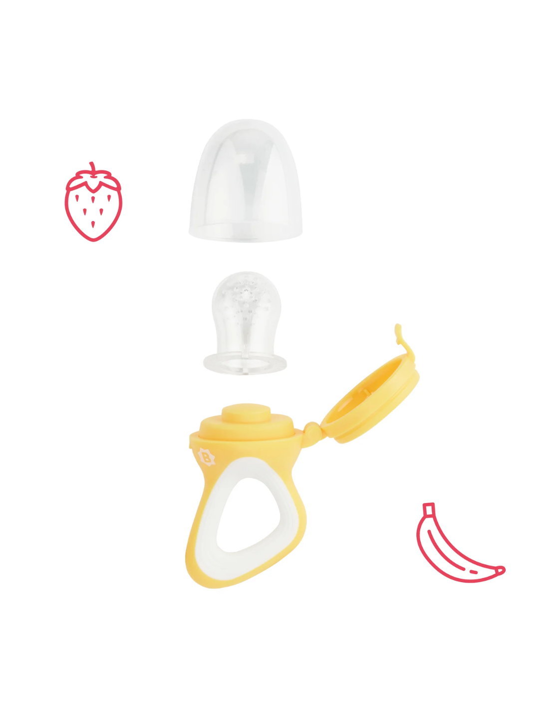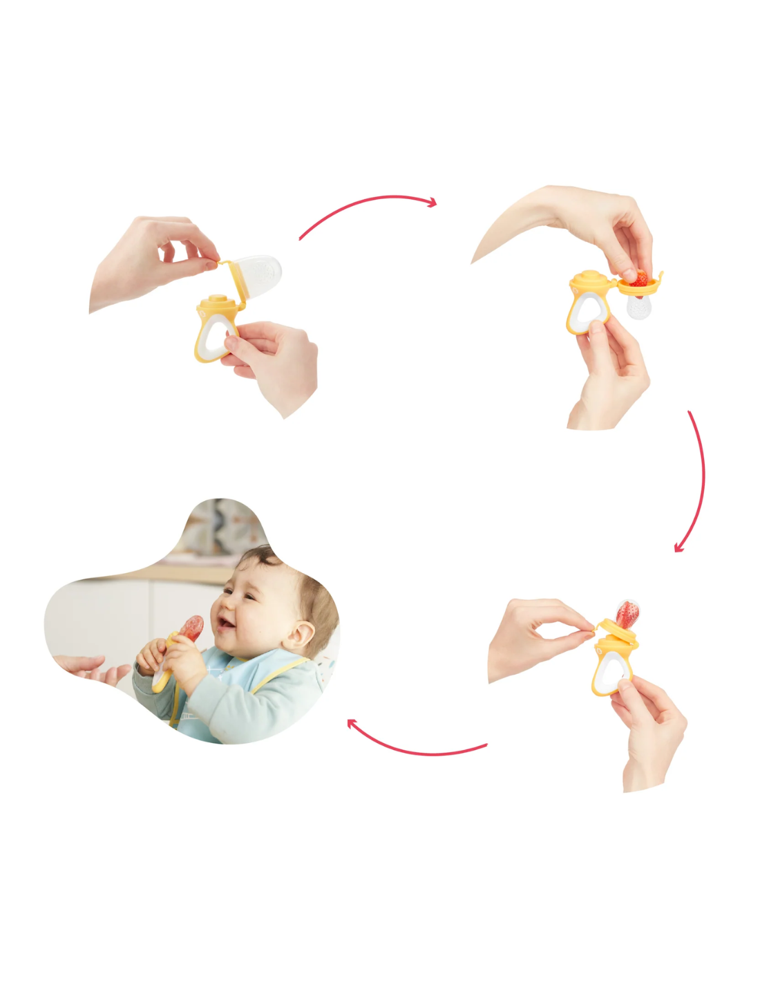 - Abrir el alimentador y llenar la tetina/malla con fruta o alimentos blandos.
