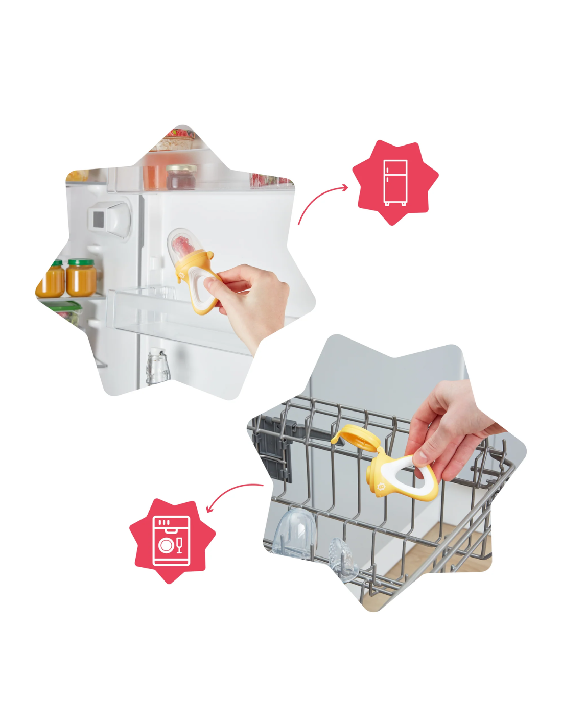 Su diseño ergonómico con mango antideslizante facilita el agarre por parte de los más pequeños, promoviendo su independencia en la alimentación. Además, si introduce alimentos fríos dentro de la tetina, el alimentador ayuda a calmar las molestias de la dentición , proporcionando un efecto refrescante y reconfortante. Para garantizar la máxima higiene, el alimentador cuenta con un capuchón protector , permitiendo llevarlo a cualquier parte sin riesgo de contaminación. Además, es fácil de lavar y apto para el lavavajillas, lo que facilita su limpieza diaria.