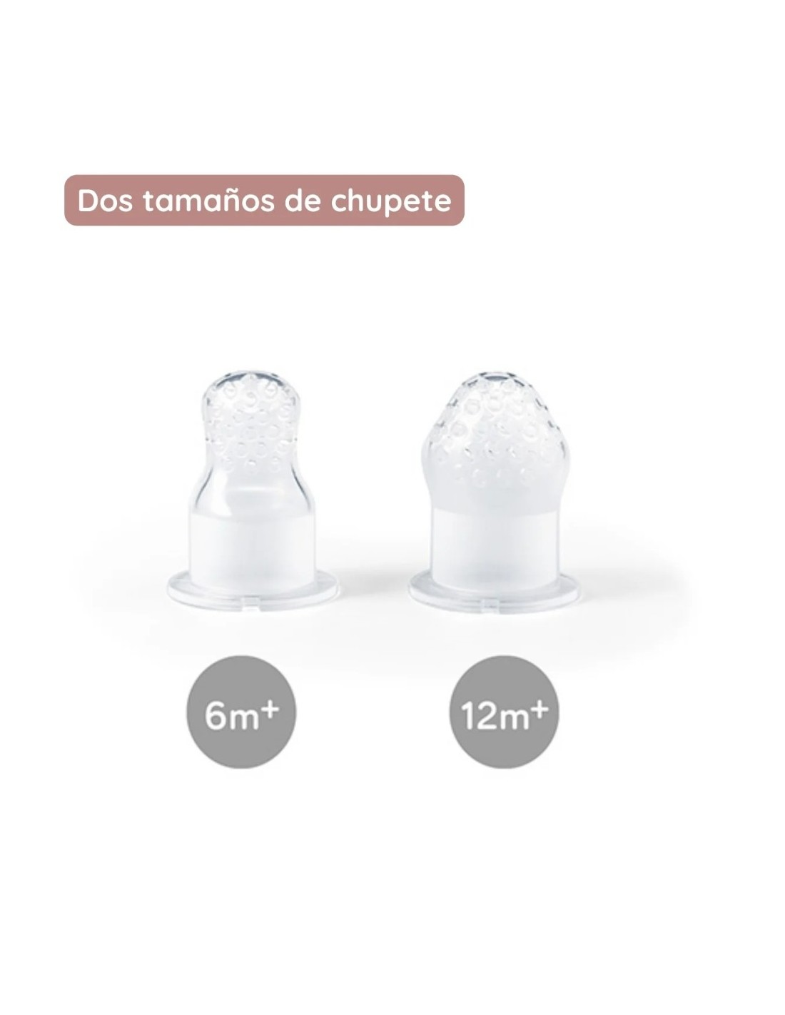 2 boquillas incluidas: una para bebés de +6 meses y otra para +12 meses, adaptadas al tamaño de los alimentos y la evolución del peque.
