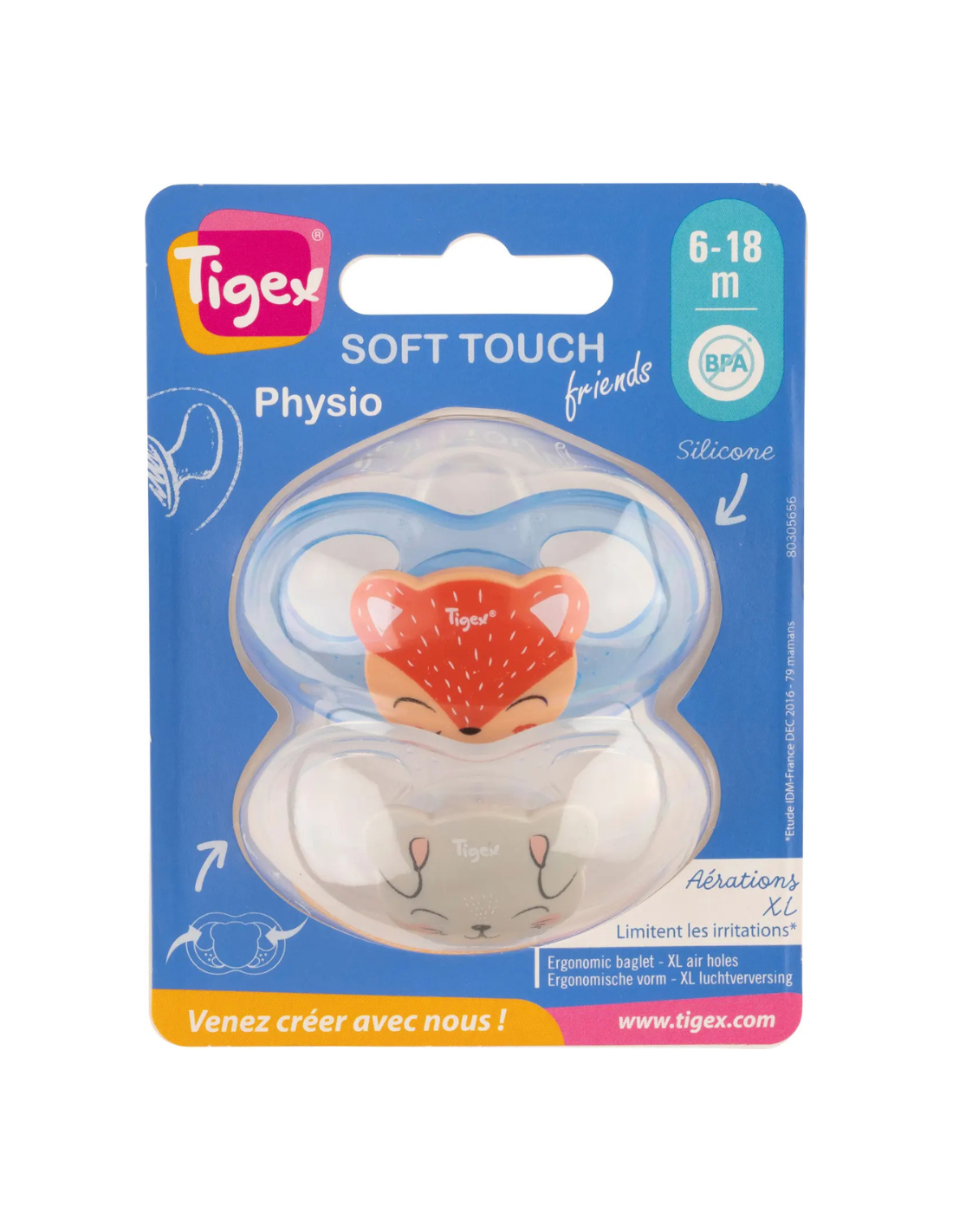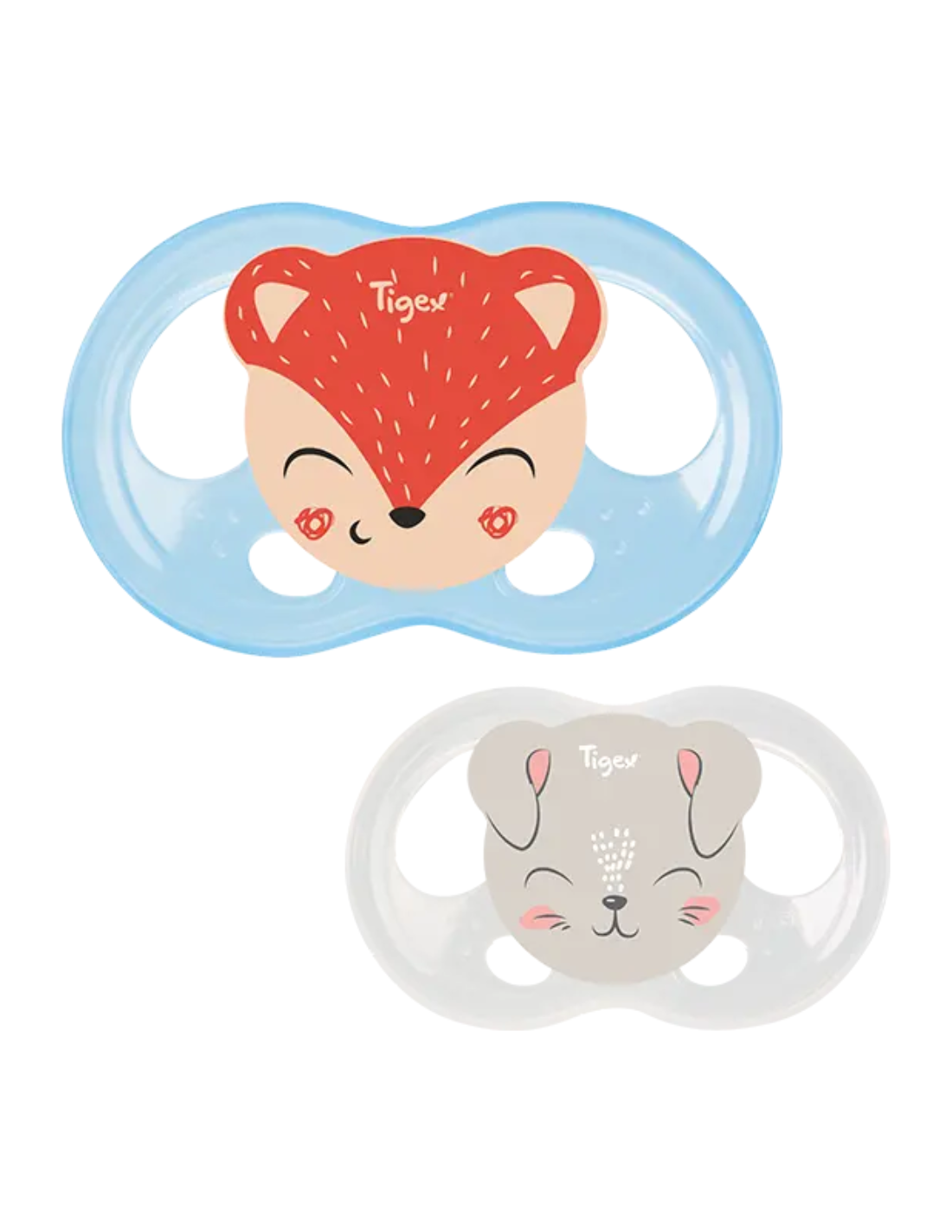 El Pack de Chupetes Tigex Soft Touch 6–18M incluye 2 unidades con diseños Conejo y Zorro, pensadas para una succión suave y natural durante la etapa 6 a 18 meses. La tetina de silicona Soft Touch (grado alimentario) ofrece una textura sedosa y flexible que calma sin interferir en el desarrollo oral. El escudo ergonómico con orificios de ventilación cuida la piel alrededor de la boca y reduce el riesgo de irritaciones.