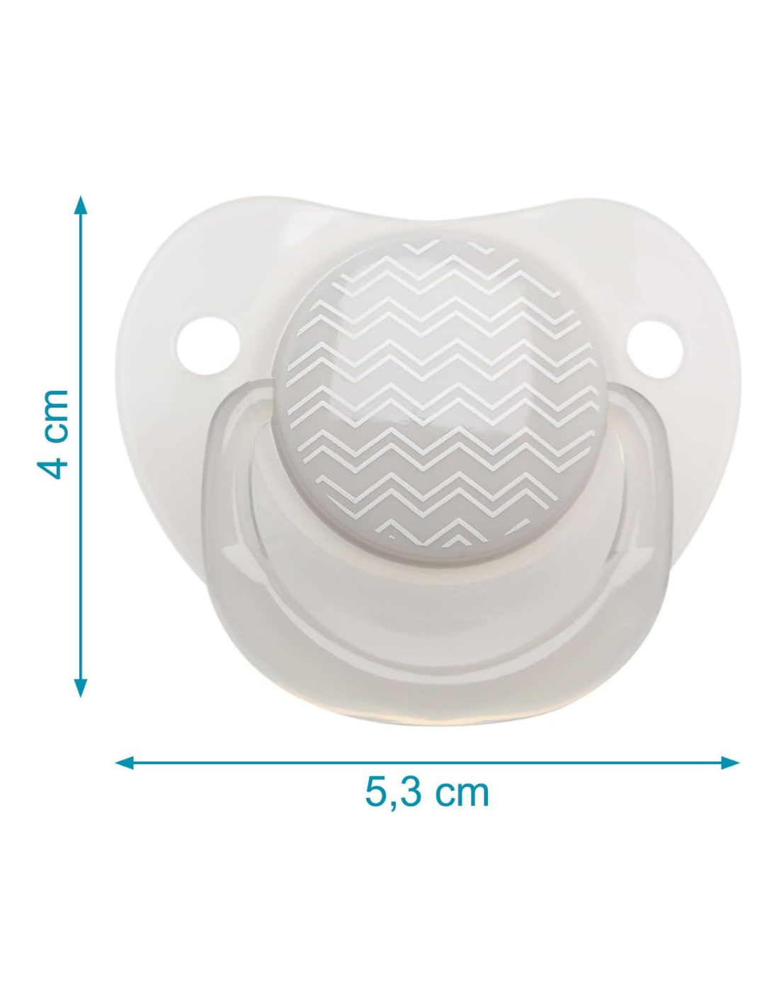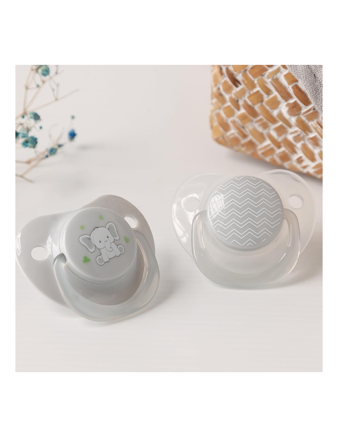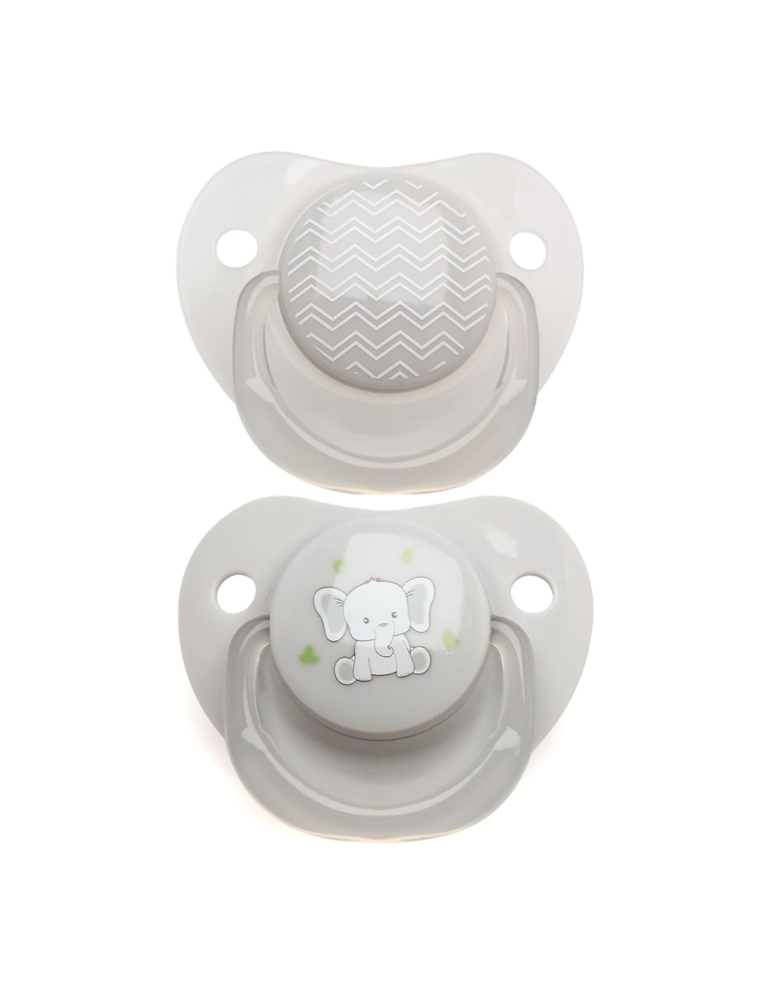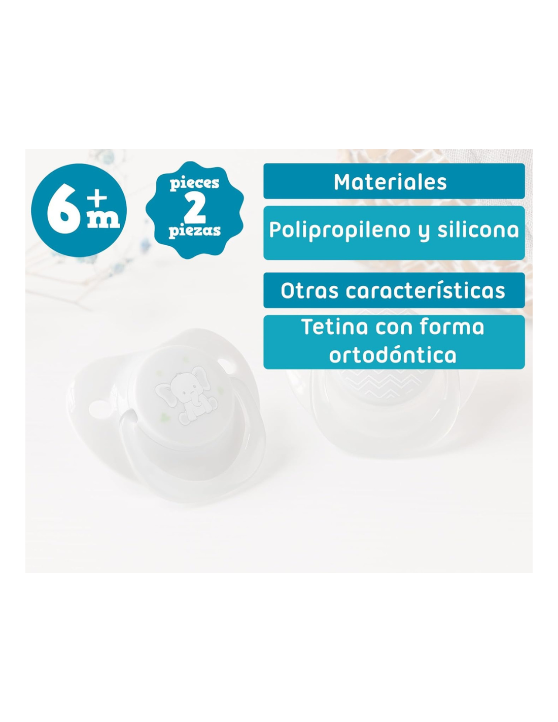 Tetina ortodóntica (simétrica) en silicona de grado alimentario, libre de BPA/BPS y ftalatos. Escudo y anilla de PP con bordes redondeados y diseño Elefante (decoración resistente).