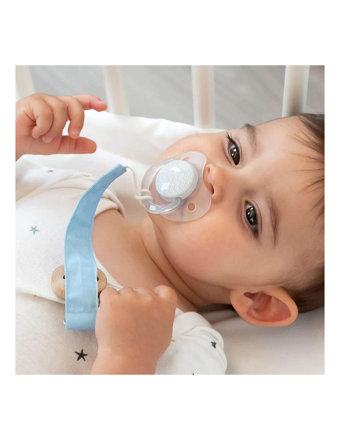 - Uso seguro: no sumerjas la tetina en sustancias dulces o medicamentos. No fijes el chupete a cuerdas, cintas o partes del vestuario que puedan provocar riesgo de estrangulamiento.