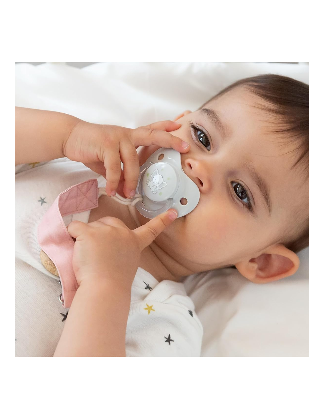 Los chupetes KioKids Dolci Amici cuentan con una tetina ortodóntica, inspirada en el pezón materno, que permite una succión natural sin interferir en el desarrollo del paladar, mandíbula y dientes del bebé. La silicona de alta calidad no absorbe olores ni sabores, y su forma y textura se mantienen inalteradas con el uso frecuente.