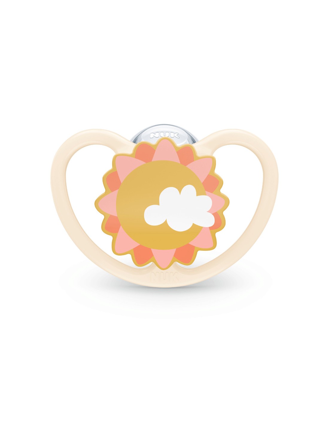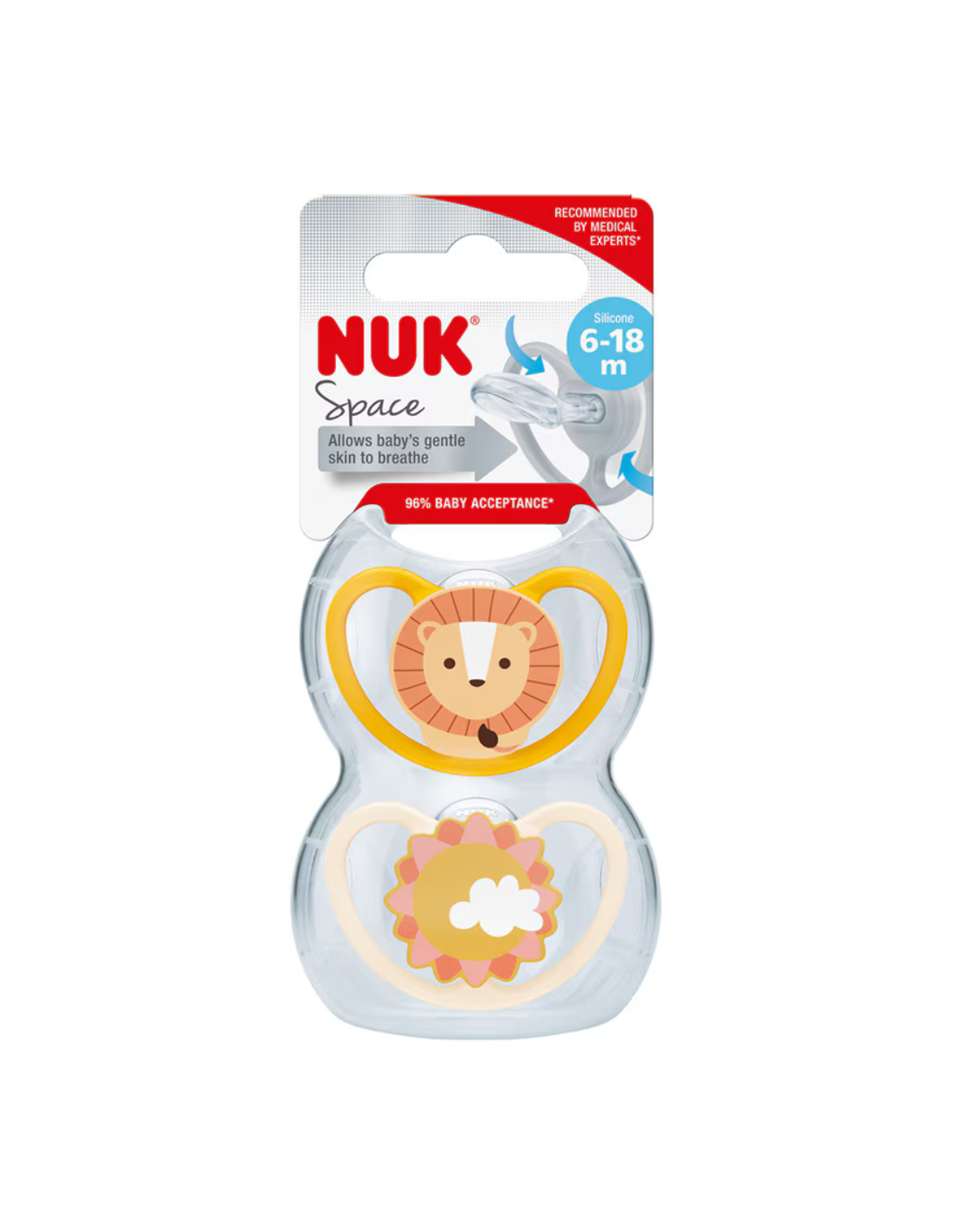 El Chupete NUK Space León/Sol de silicona – pack 2 (6–18 M) está diseñado para un descanso cómodo y seguro durante la etapa de dentición temprana. Su escudo Space con grandes aberturas de ventilación reduce el contacto con la piel y ayuda a evitar la humedad y las irritaciones. La tetina fisiológica/ortodóntica de silicona se adapta al paladar, deja espacio a la lengua y favorece un desarrollo bucodental saludable.