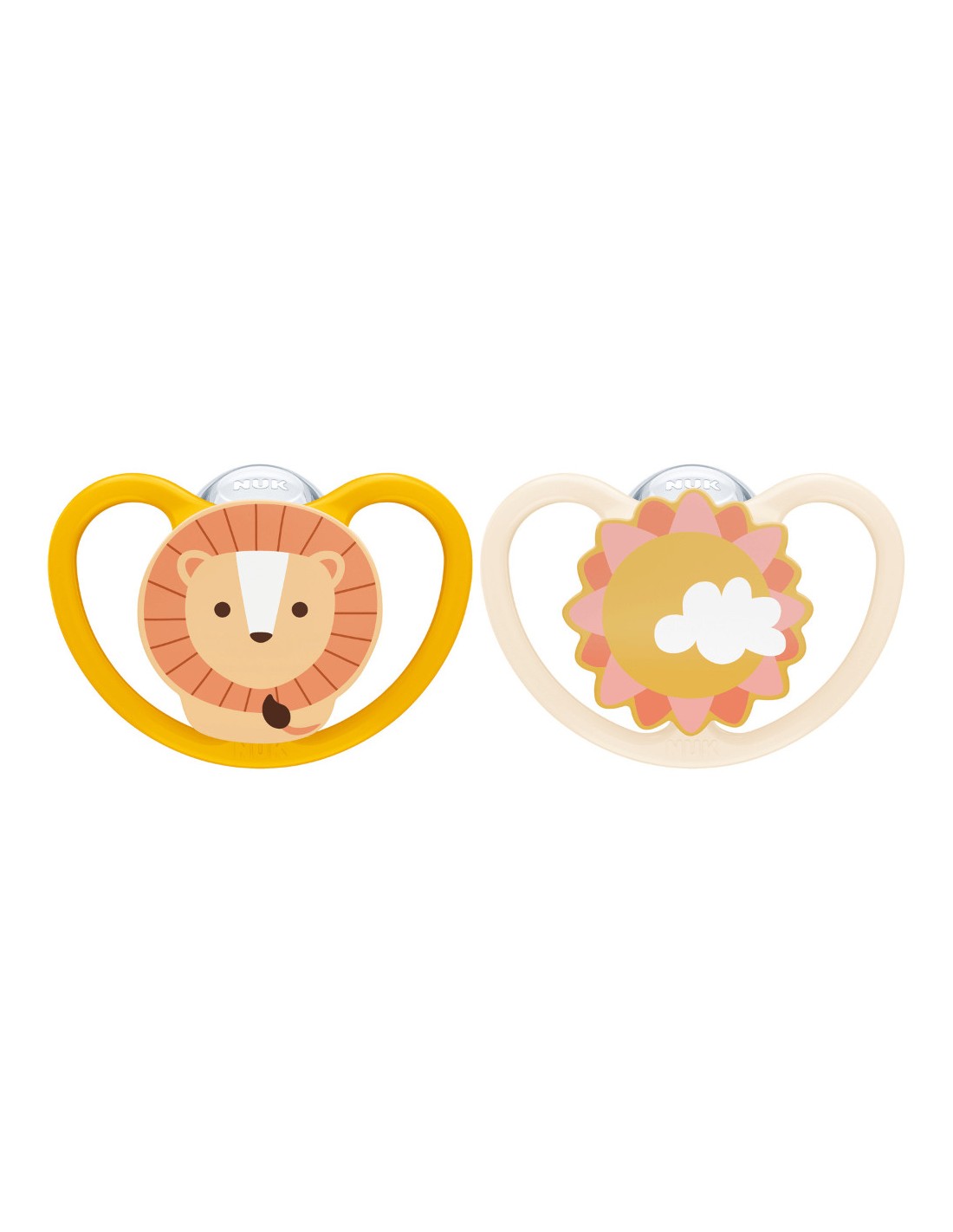 Incluye 2 chupetes con decoraciones León y Sol. Fabricados con materiales de grado alimentario y libres de BPA/BPS.