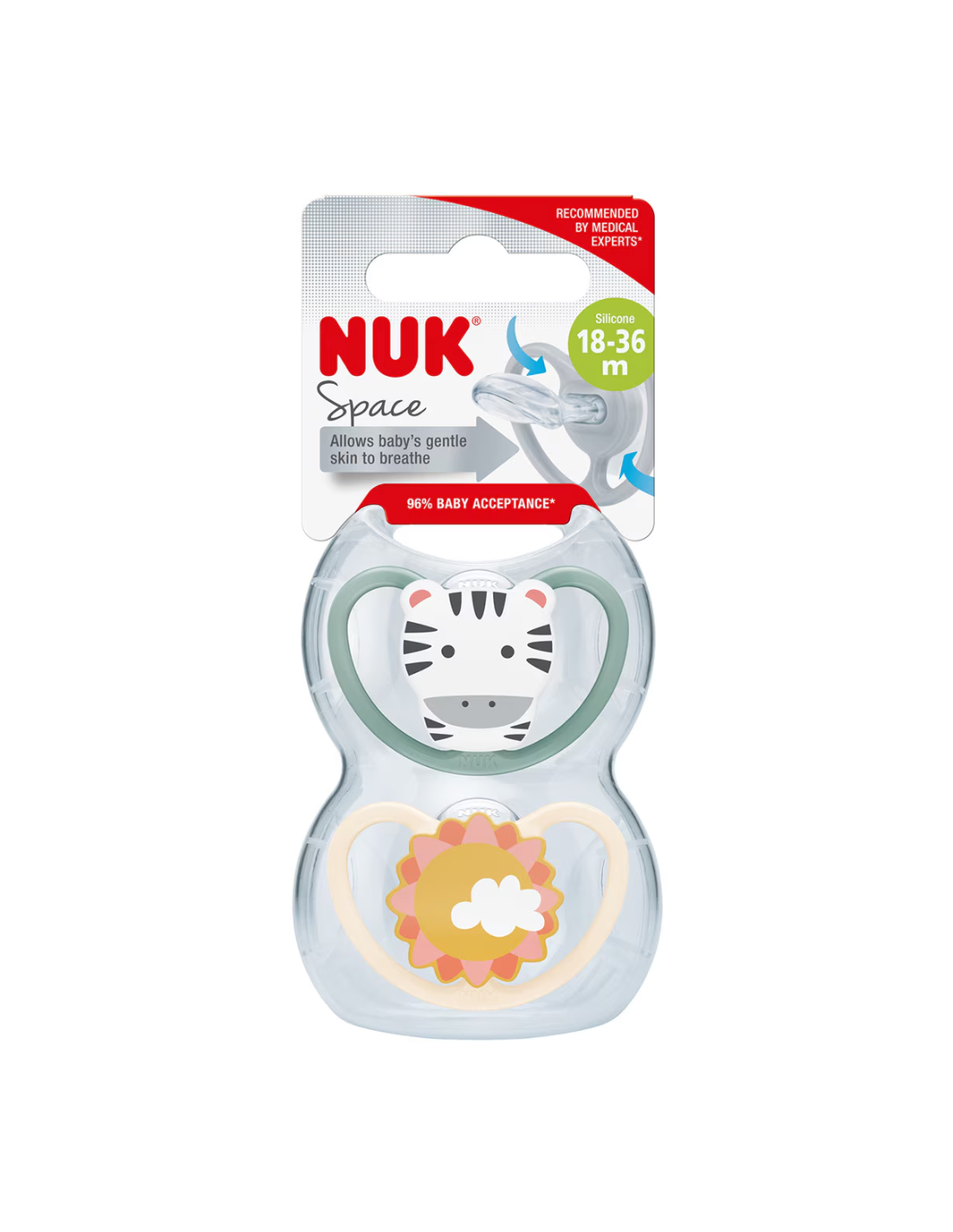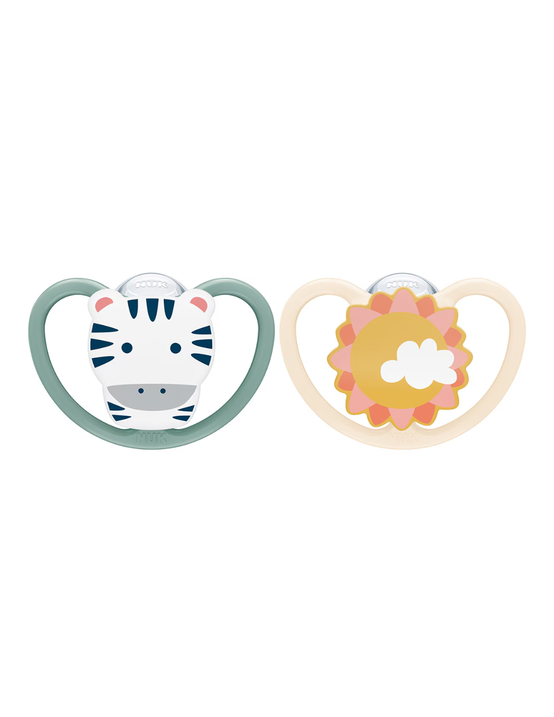 Los chupetes Space están diseñados pensando en la delicada piel de los bebés. Su escudo con orificios extra grandes garantiza una óptima circulación del aire, previniendo irritaciones y rojecimientos en la zona peribucal. La tetina anatómica de silicona es plana y suave en la base, proporcionando mayor espacio para los movimientos de succión y un ajuste perfecto al paladar del niño. La silicona utilizada es completamente neutra en sabor y olor, además de resistente al calor, facilitando su limpieza y esterilización. El pack incluye una práctica caja portachupetes , ideal para transportar y esterilizar los chupetes de manera segura en el microondas.