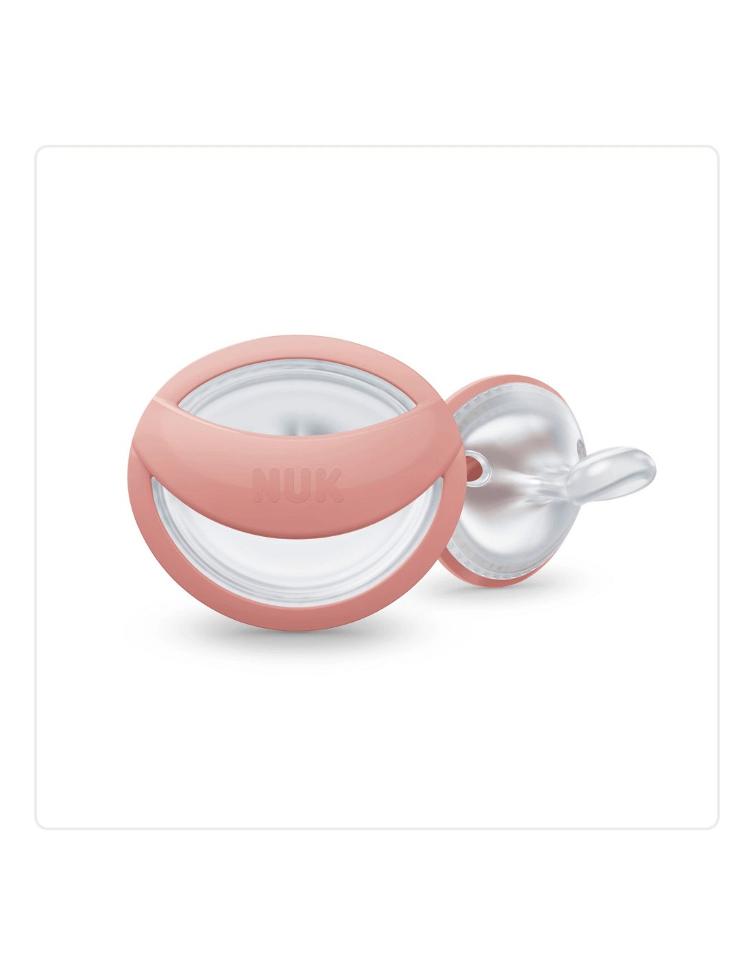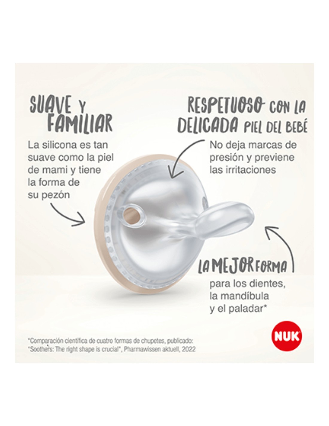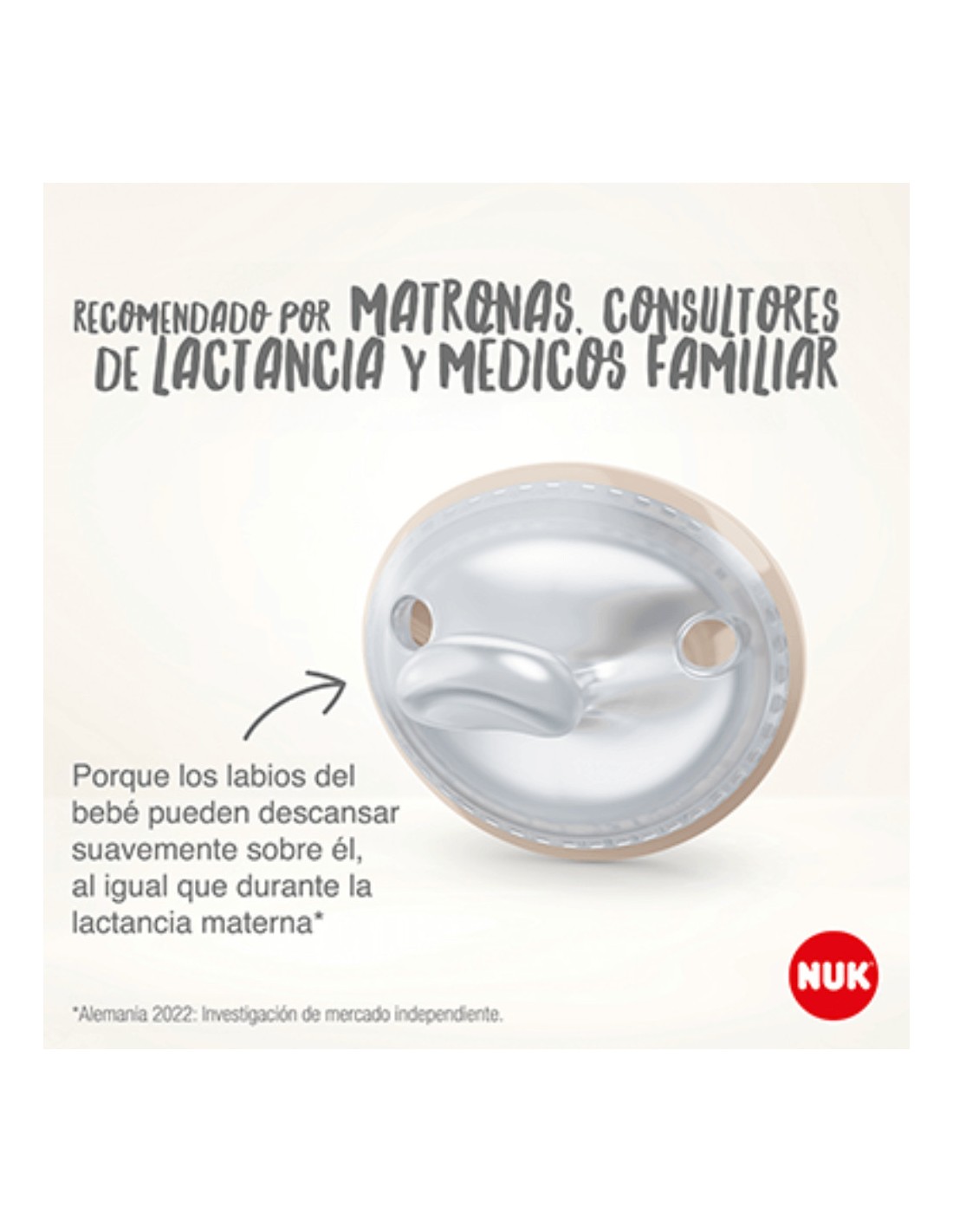 Este chupete ha sido desarrollado científicamente para ser compatible con la lactancia materna, logrando que el 98 % de las madres confirmen su eficacia al calmar al bebé sin interferir con la lactancia. La tetina de silicona es tan suave y familiar como el pezón de mamá, ofreciendo una sensación natural que tranquiliza al bebé. El diseño permite que los labios del bebé descansen suavemente sobre la tetina, replicando el movimiento natural que ocurre durante la lactancia. Gracias a su forma original de NUK, es ideal para el correcto desarrollo de los dientes, la mandíbula y el paladar, siendo uno de los chupetes con menor impacto en el desarrollo bucal. Fabricado sin BPA, el pack incluye dos chupetes y una práctica caja reutilizable para mantenerlos limpios y esterilizados.