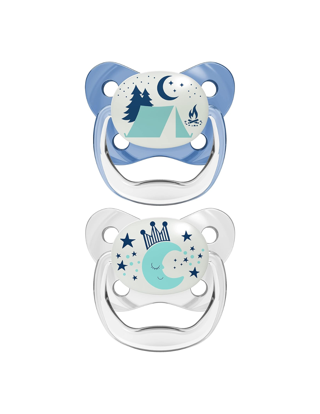 Chupete Prevent Nocturno azul Dr. Brown’s 6-18M. Con diseño luminoso que brilla en la oscuridad. Tetina ortodóntica que reduce la presión sobre el paladar y favorece el desarrollo bucodental.