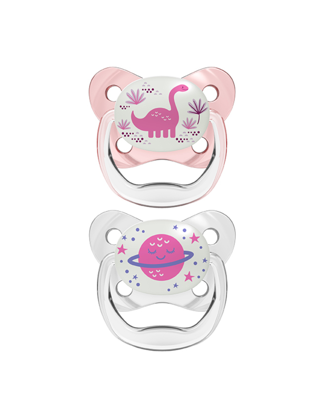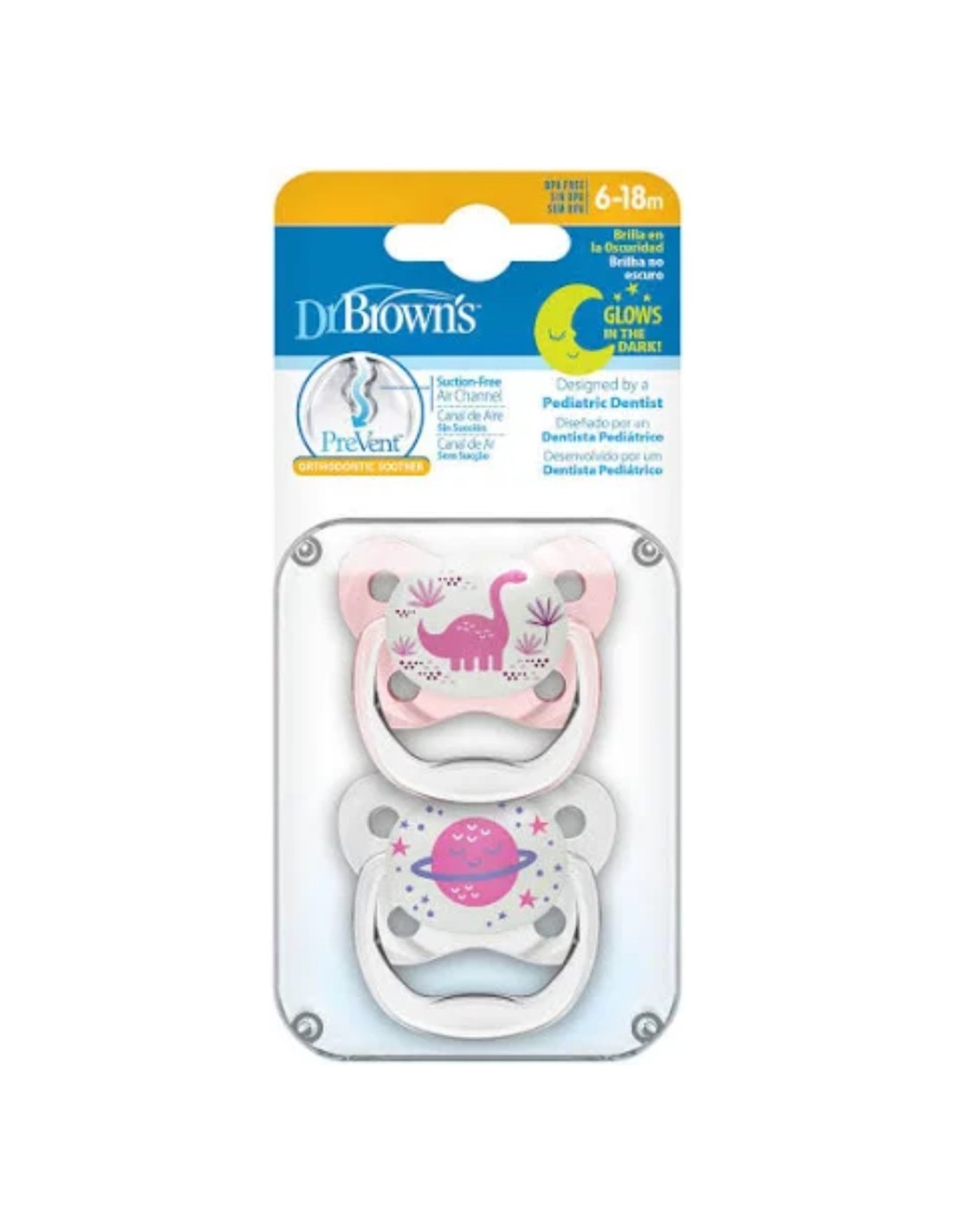 El Chupete Prevent Nocturno 6-18M Dr. Brown’s está diseñado por odontopediatras para reducir la presión en el paladar durante la succión, protegiendo el desarrollo bucodental del bebé. Su tetina ortodóntica de silicona médica tiene una base delgada y una cavidad de aire que minimiza la presión sobre el paladar y la mandíbula. Además, su exclusivo diseño brilla en la oscuridad, ayudando a los padres a encontrarlo fácilmente durante la noche sin encender la luz.