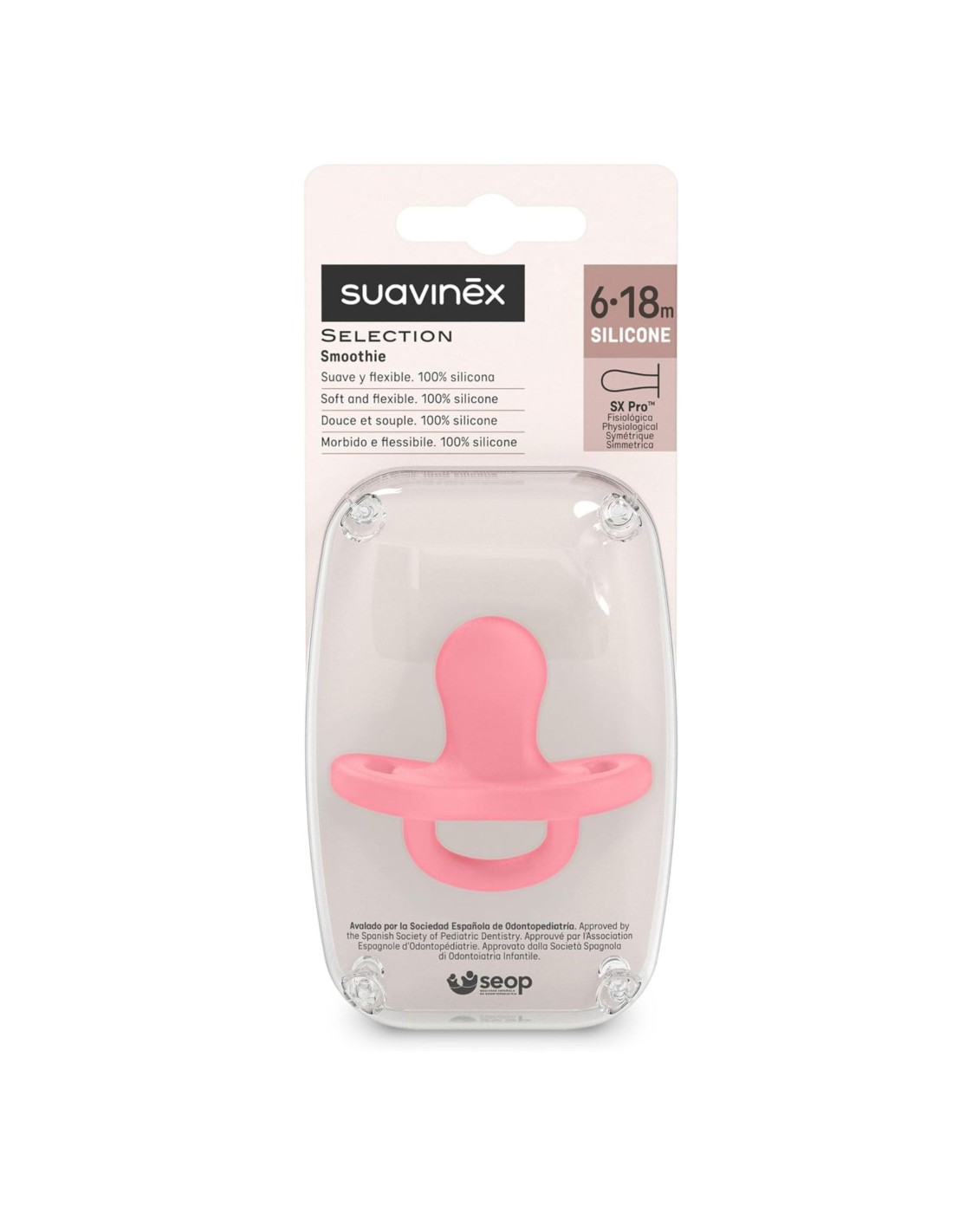 El Chupete Todo Silicona Suavinex es ideal para bebés de 6 a 18 meses gracias a su diseño en una única pieza de silicona médica, suave y flexible.