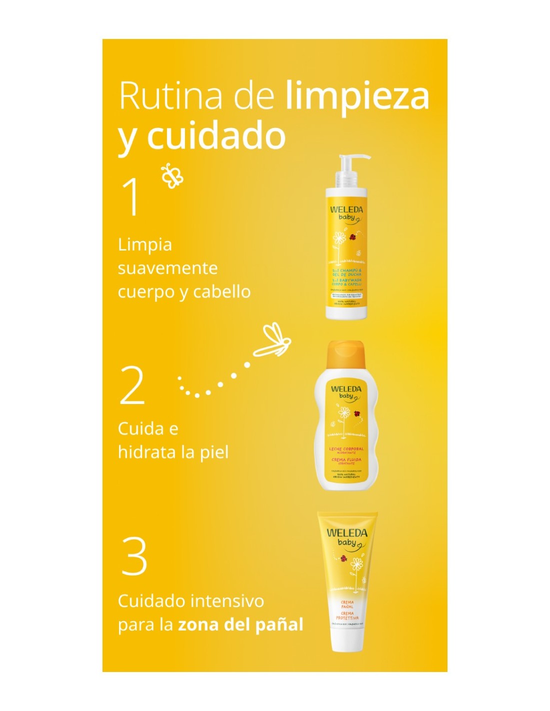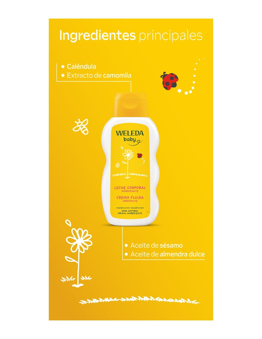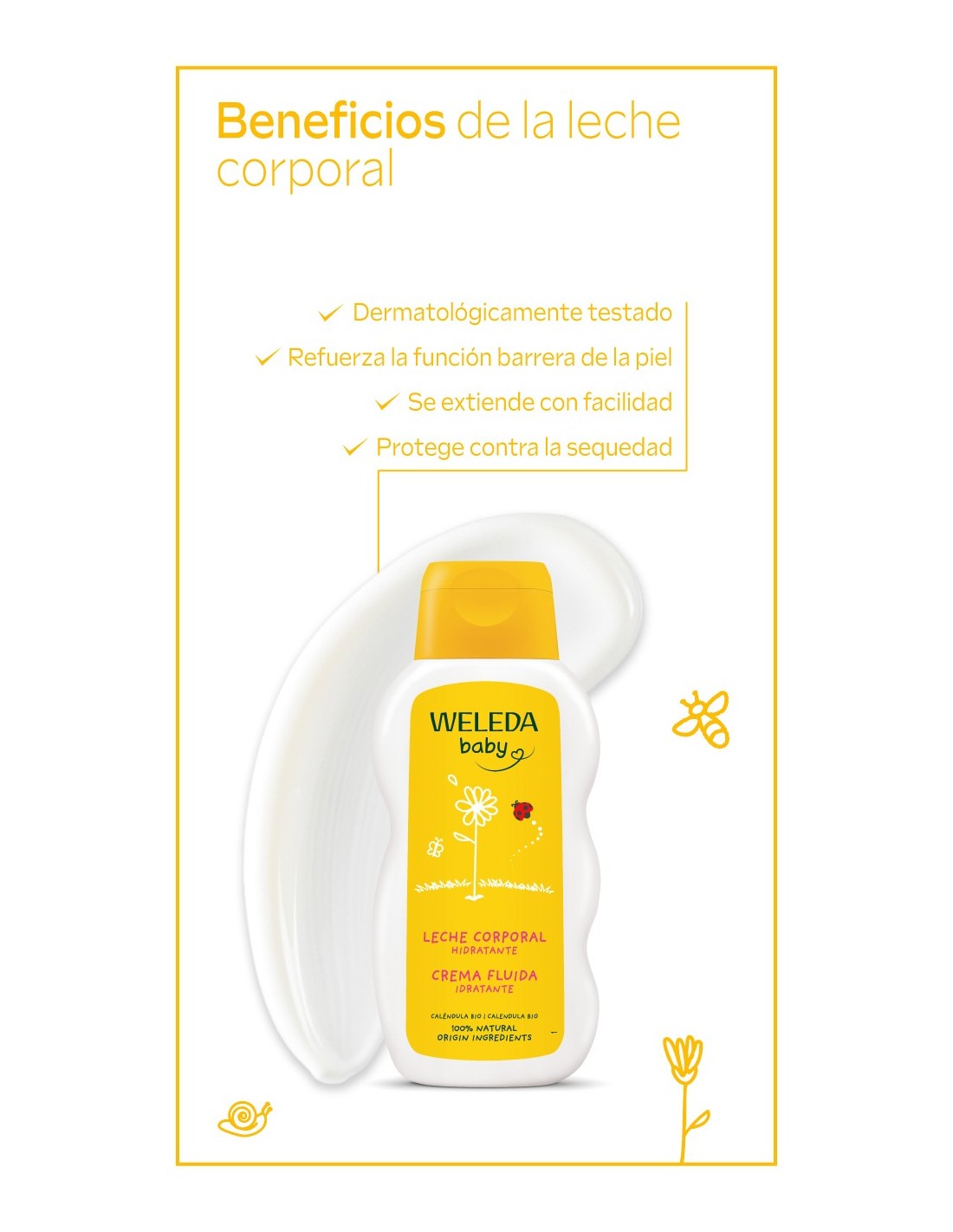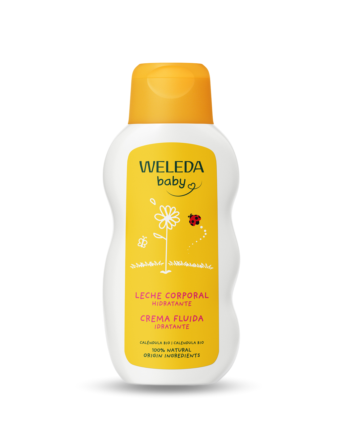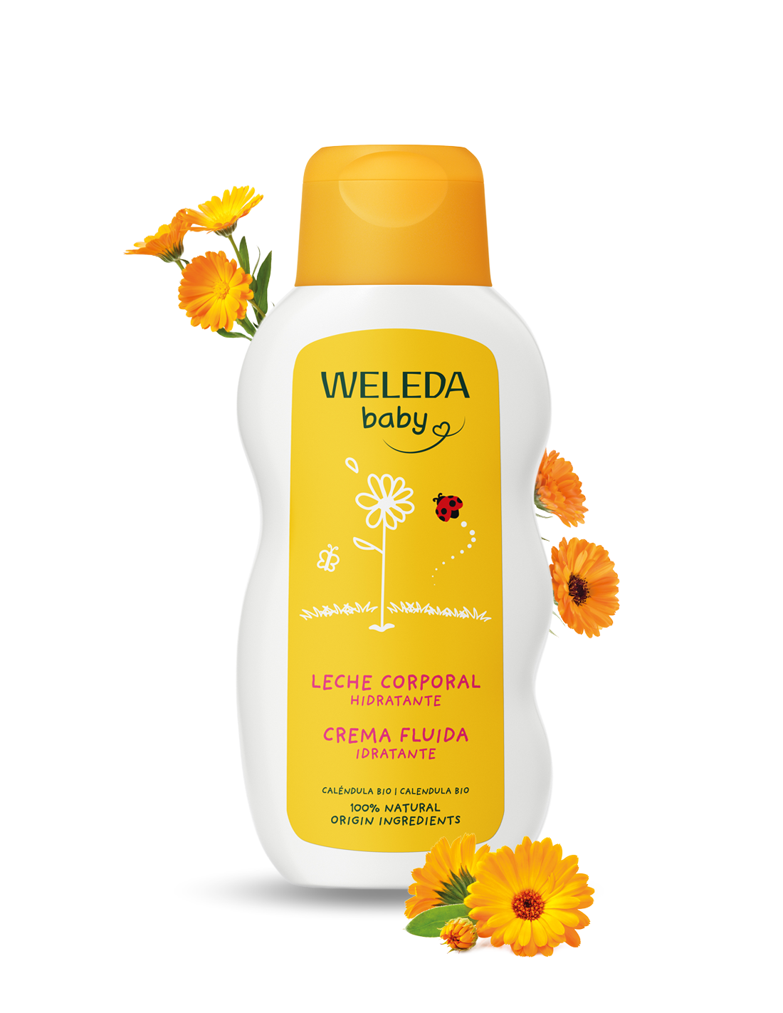 La Leche Corporal de Caléndula Weleda es una emulsión ligera y natural que hidrata, nutre y calma la piel del bebé después del baño o en cualquier momento del día.