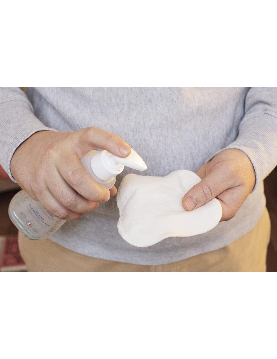 Impregnar un algodón o toallita reutilizable con el agua limpiadora y pasar suavemente por la piel del bebé hasta eliminar la suciedad. No es necesario enjuagar.