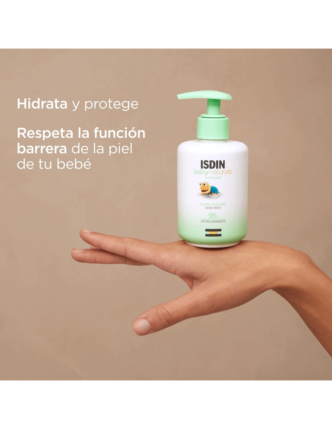 Babynaturals Loción Corporal ISDIN, formulada con 96% de ingredientes naturales, hidrata, suaviza y protege la delicada piel del bebé. Apta desde el nacimiento, refuerza la barrera cutánea y aporta una sensación inmediata de confort y frescor.