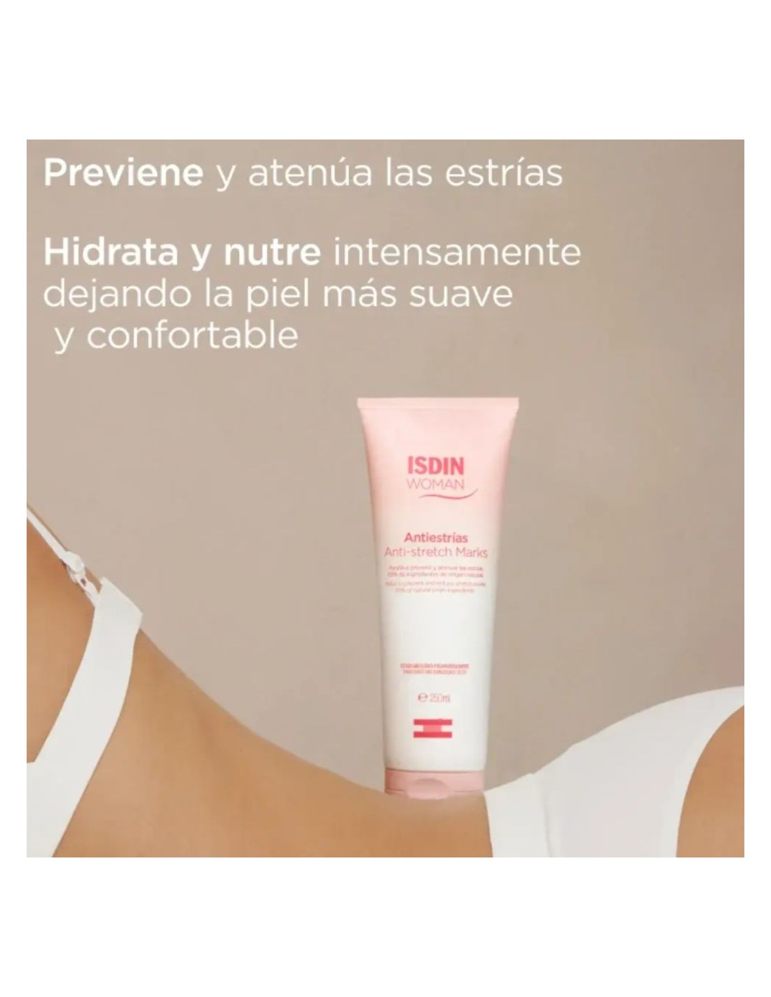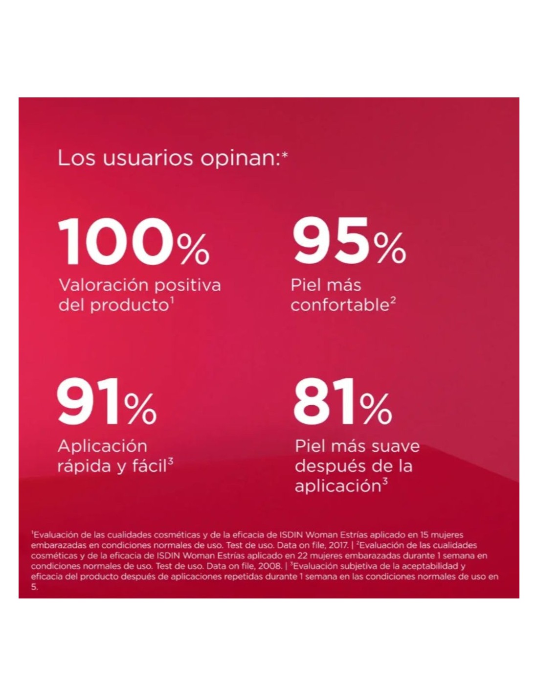 - Aplique la cantidad necesaria de ISDIN Woman Antiestrías sobre la piel limpia y seca de vientre, muslos, caderas y glúteos.