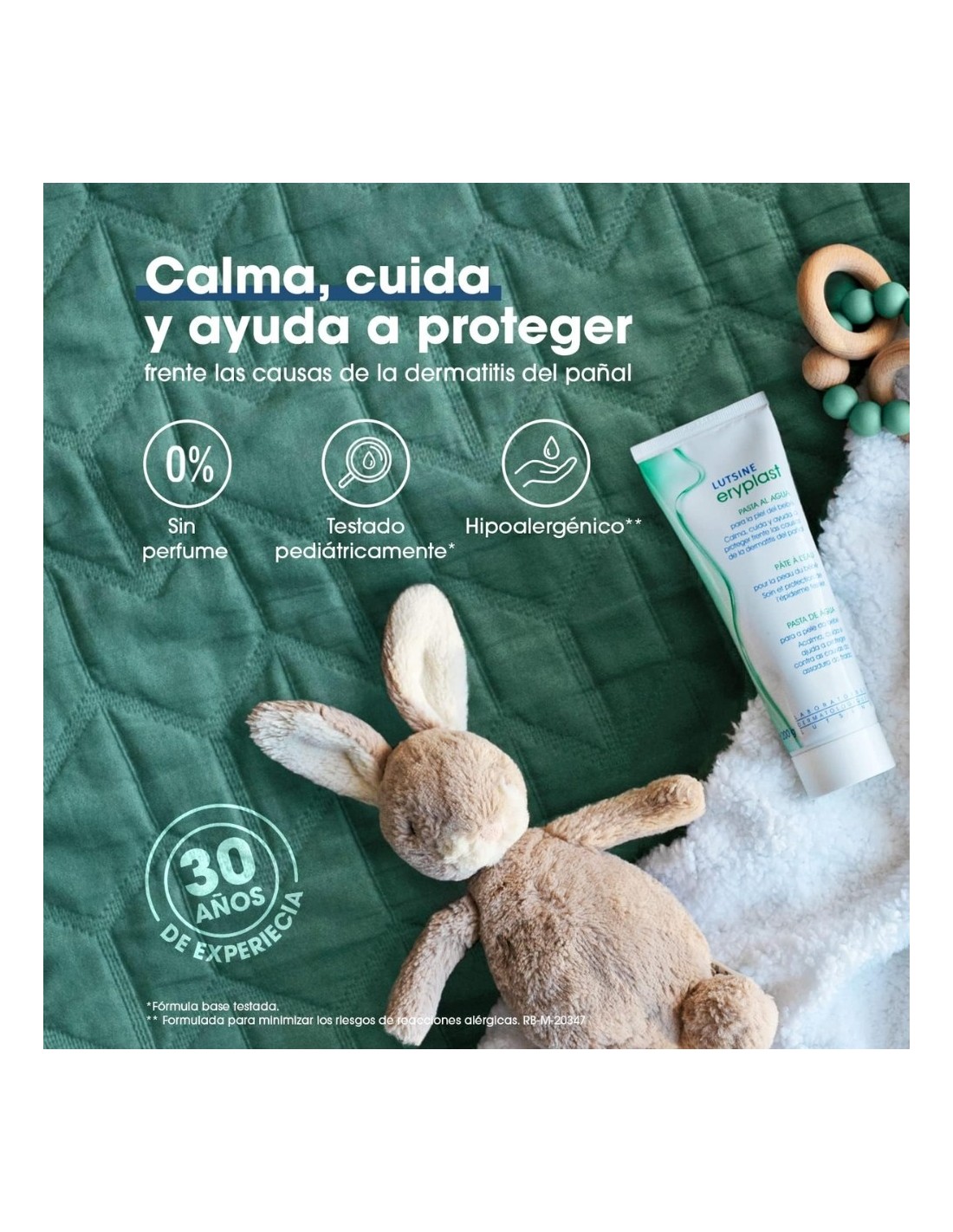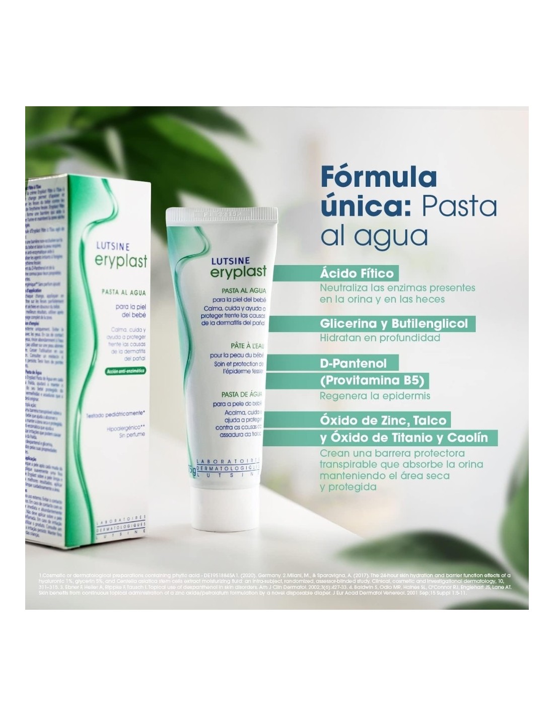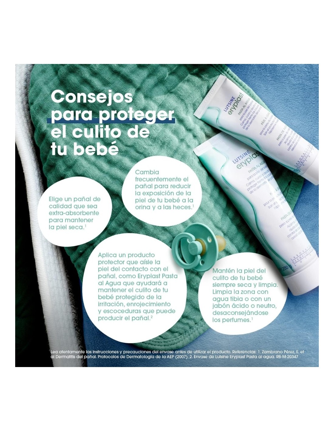 Eryplast Pasta al Agua es la aliada perfecta para calmar, cuidar y proteger la piel del bebé, especialmente en la zona del pañal. Formulada con óxido de zinc, dexpantenol y glicerina, esta pasta proporciona una triple acción protectora: crea una barrera transpirable, neutraliza agentes irritantes y calma la piel irritada. Su textura suave y fácil de aplicar forma una película que mantiene la zona seca y aliviada, ayudando a prevenir la aparición de dermatitis del pañal, rojeces y escoceduras.