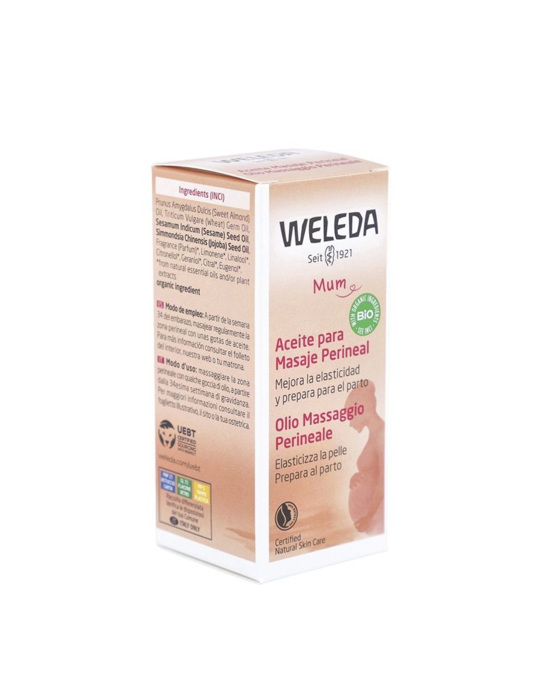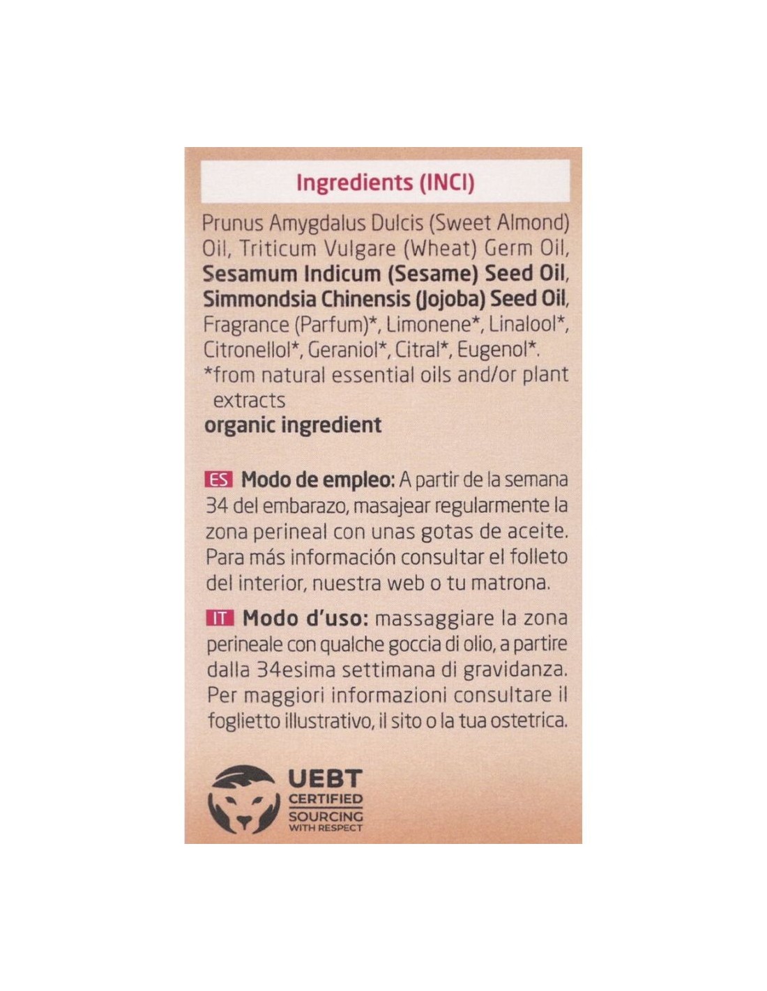 El Aceite para Masaje Perineal de Weleda cuenta con el prestigioso sello Natrue, que garantiza el uso de ingredientes naturales y orgánicos en su fórmula. Asimismo, el certificado UEBT asegura que este producto respeta la biodiversidad y fomenta el comercio justo y ético.